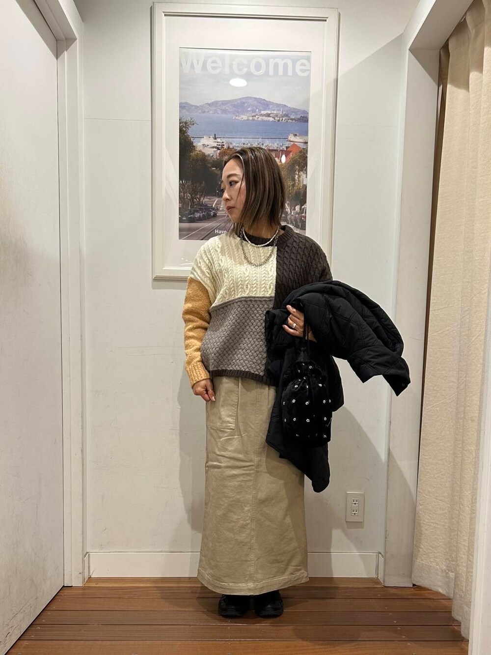 パッチワークニットは差し色カラーで明るくなりデザインがオシャレなので、一枚持ってると安心です!