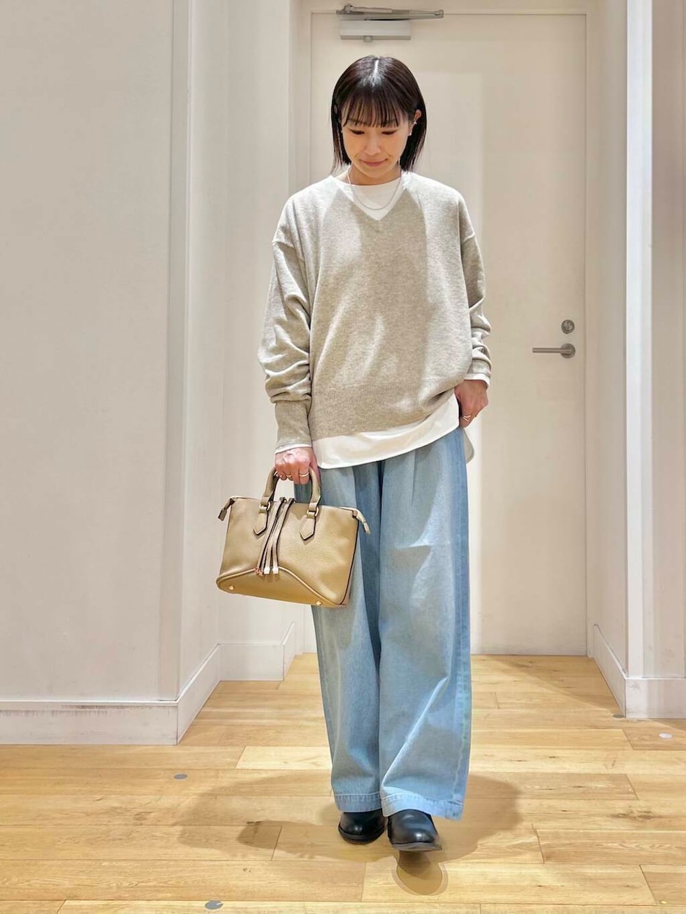浅めのVネックでインナーも気にせず着用できて、女性らしい上品な印象も与えてくれますよ!