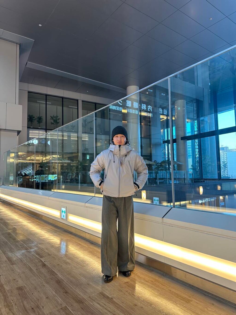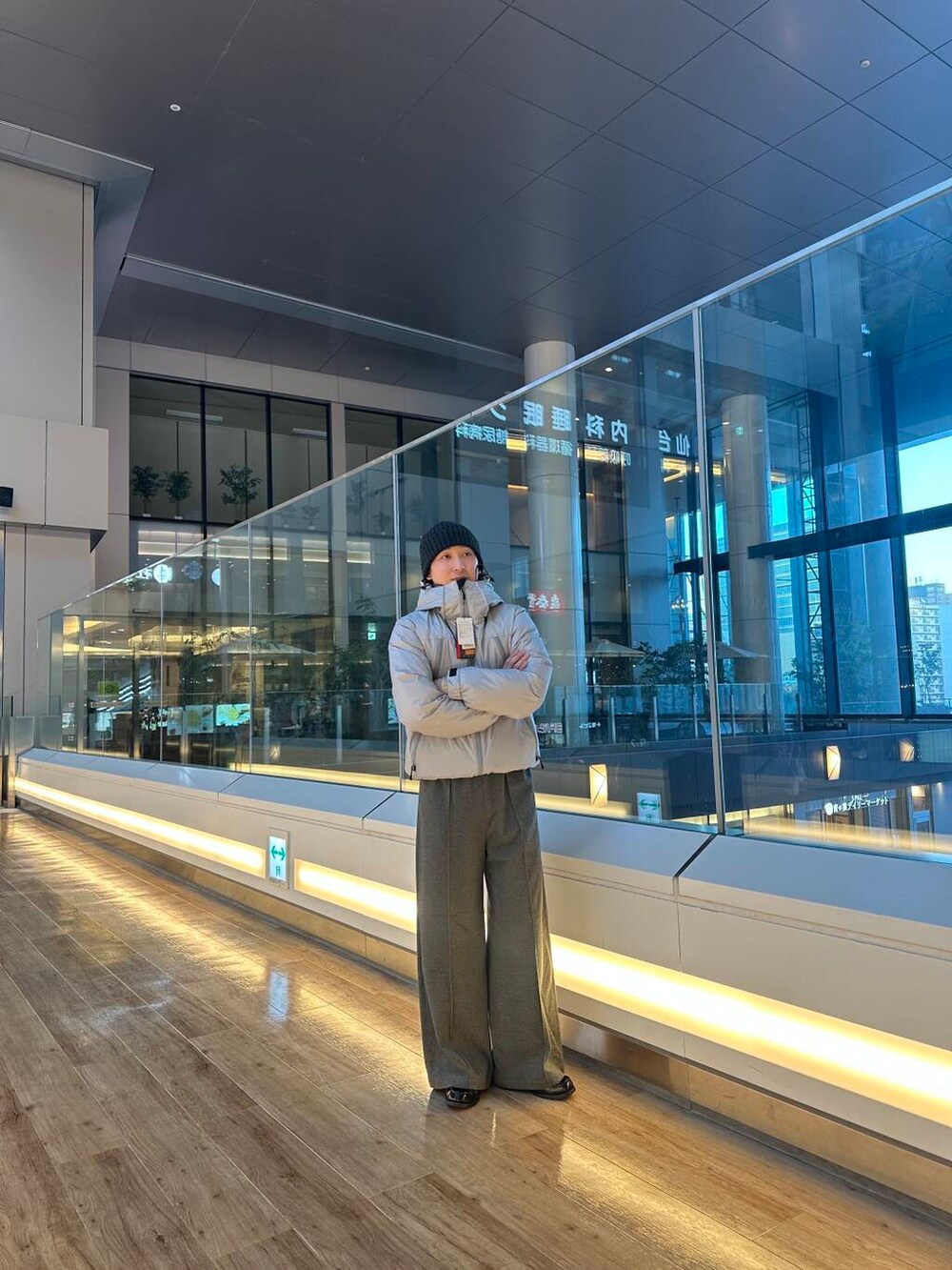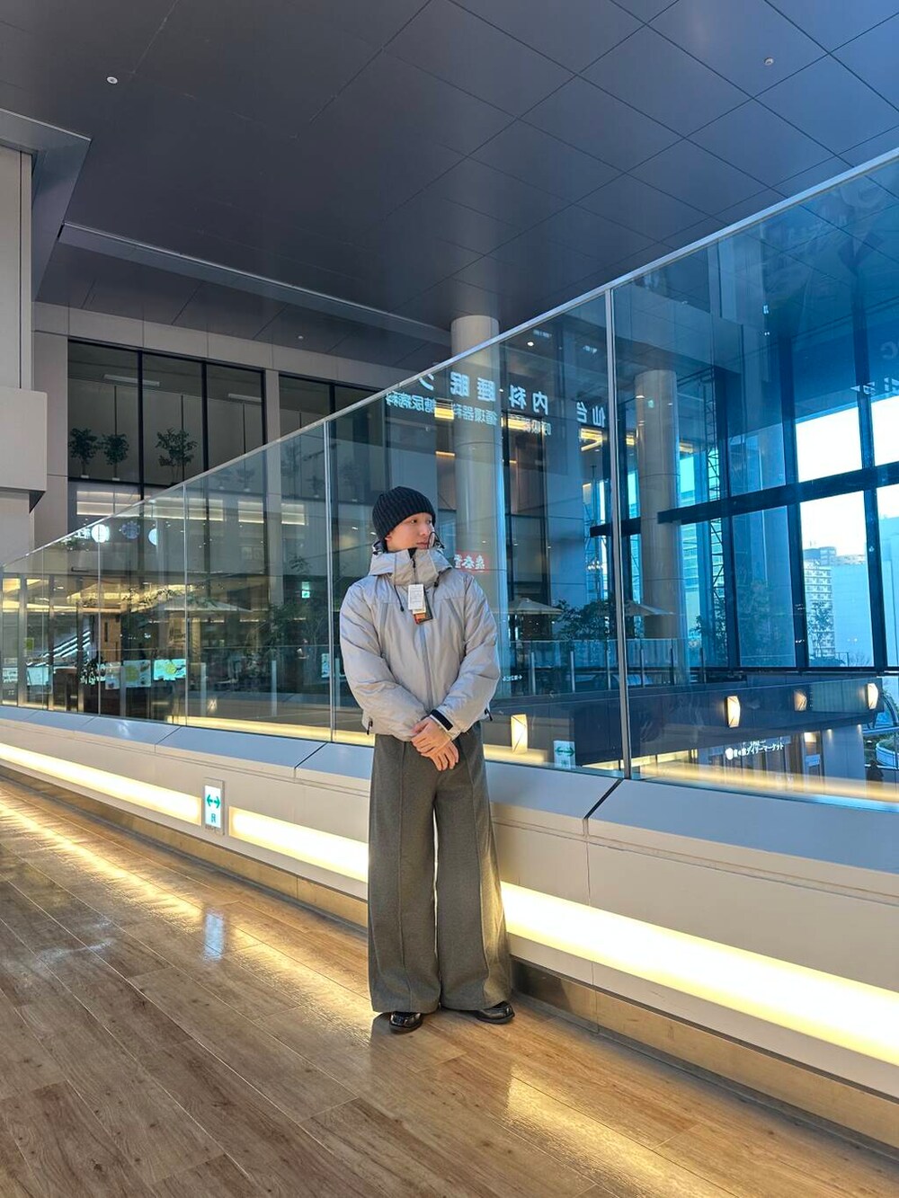 短丈にしたAURORAと太めのパンツでAラインシルエットにしました。真冬の様です。