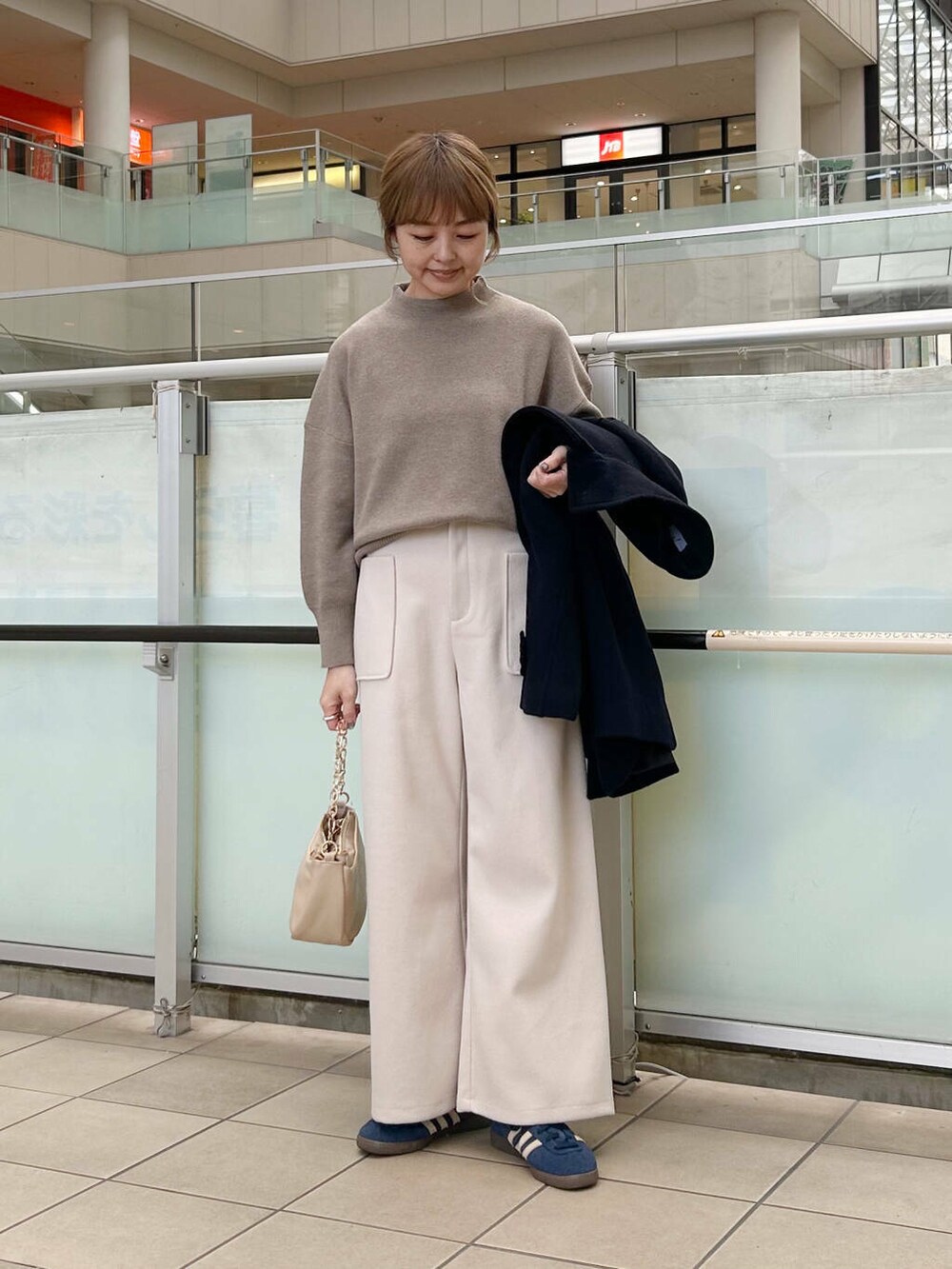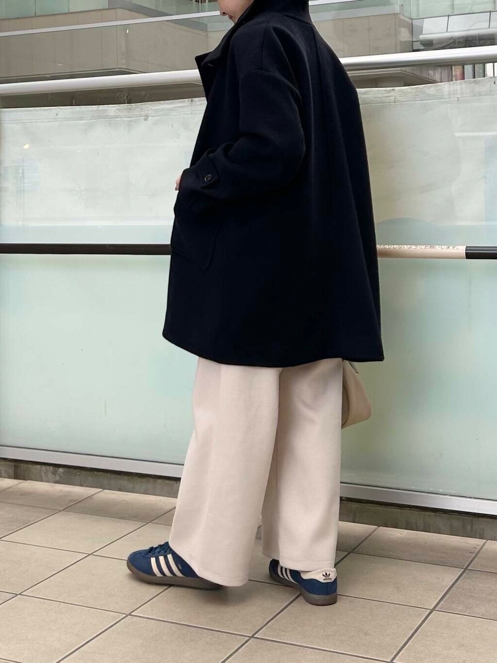 アウターはスタンドカラーコートを羽織りました。オンオフ使えるシンプルなコートです。