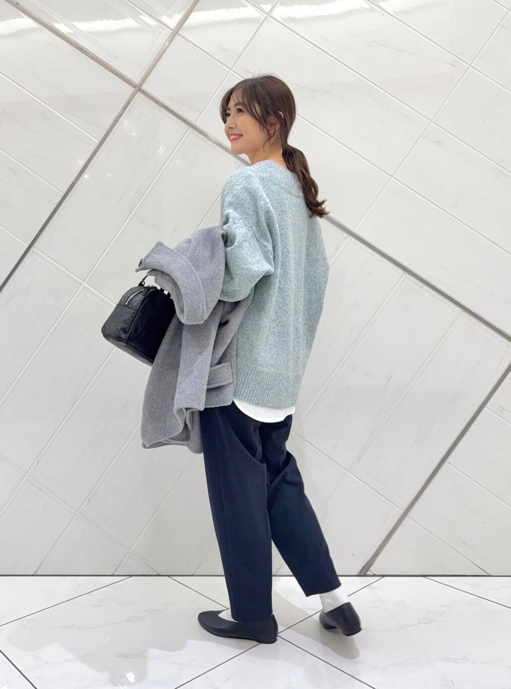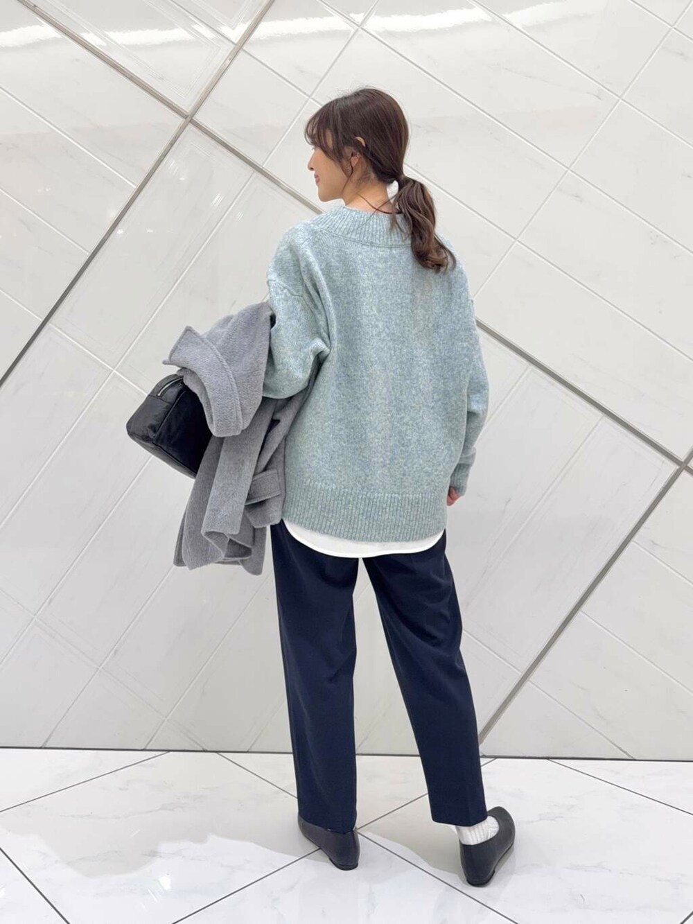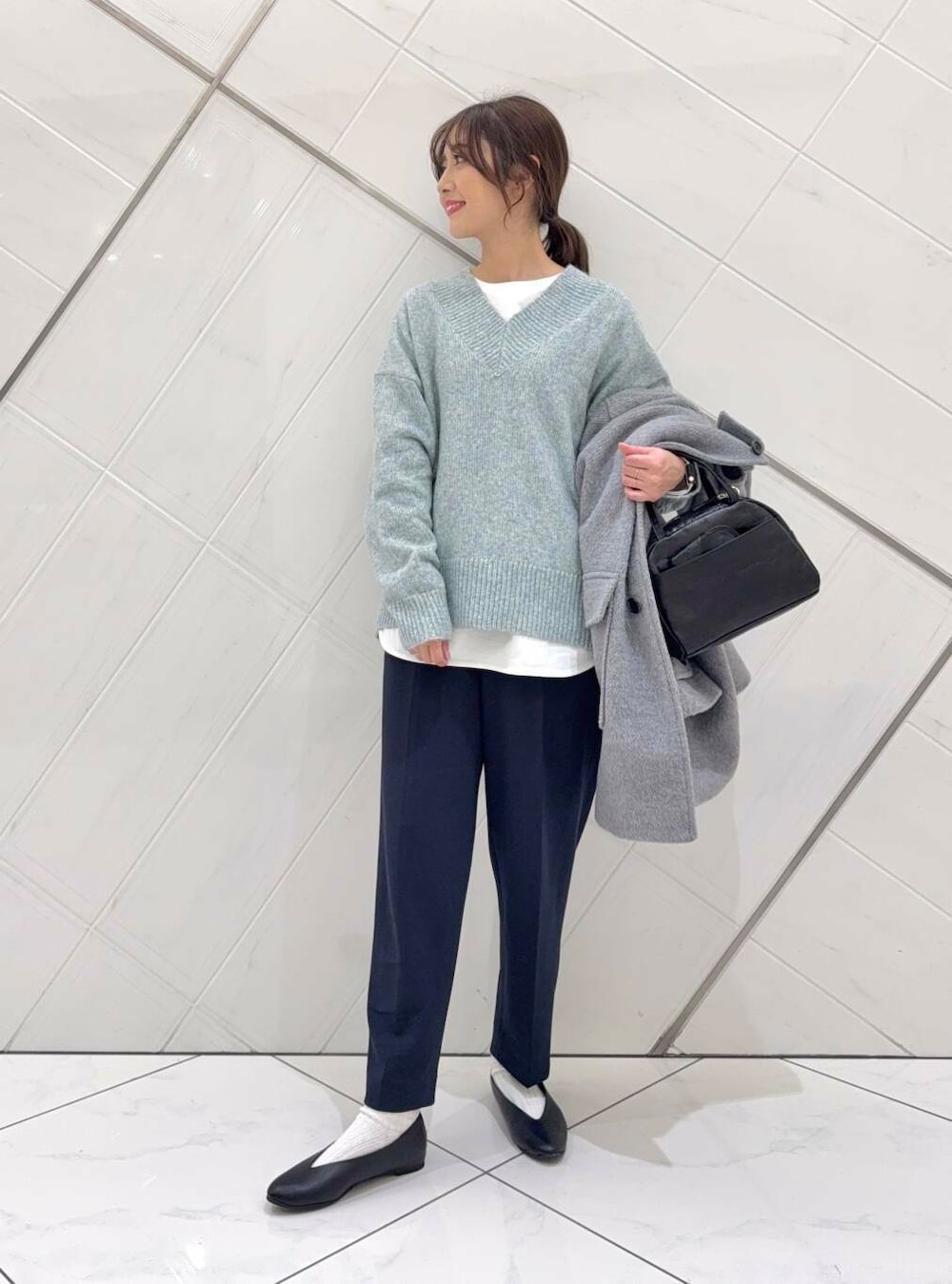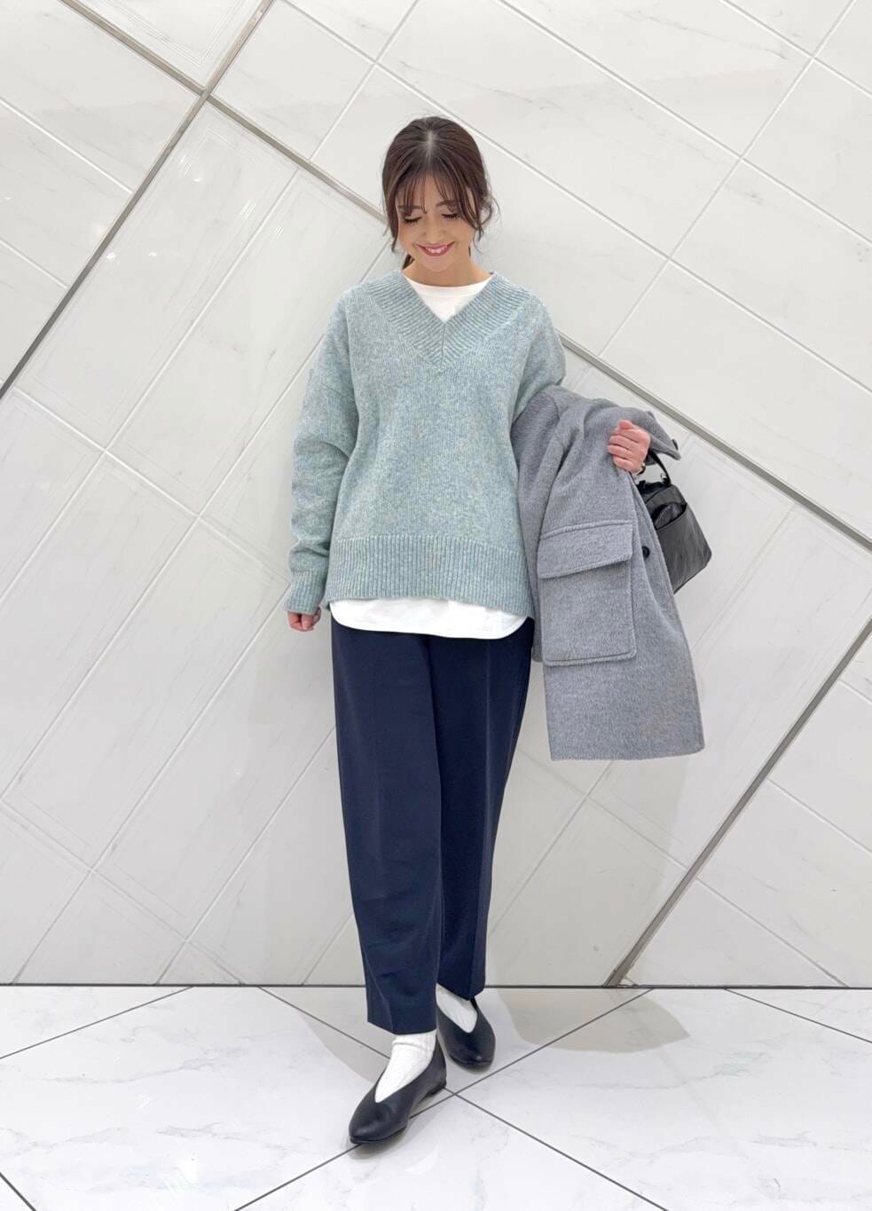 ニットはVネックなのでカットソーをレイヤードするとカジュアルな印象になります。
