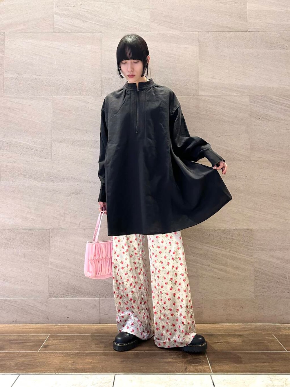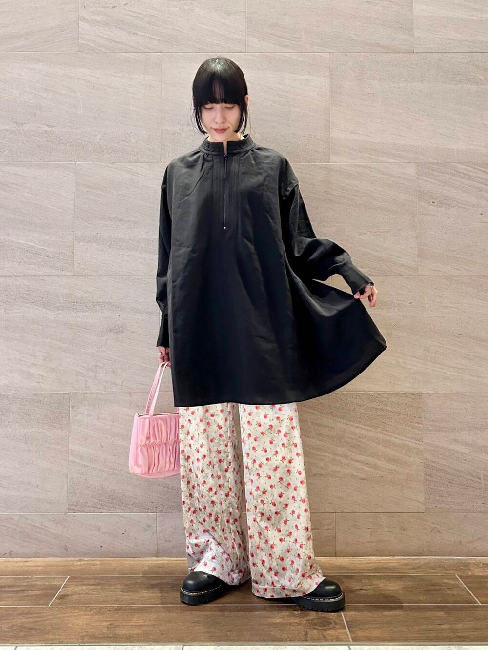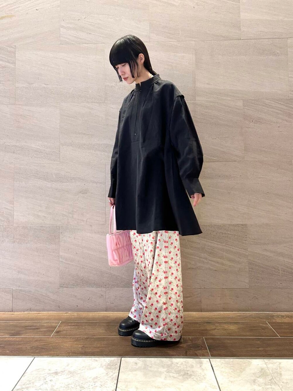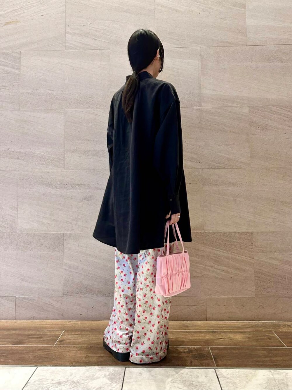 ポイントにピンクカラーのミニバッグをプラス。