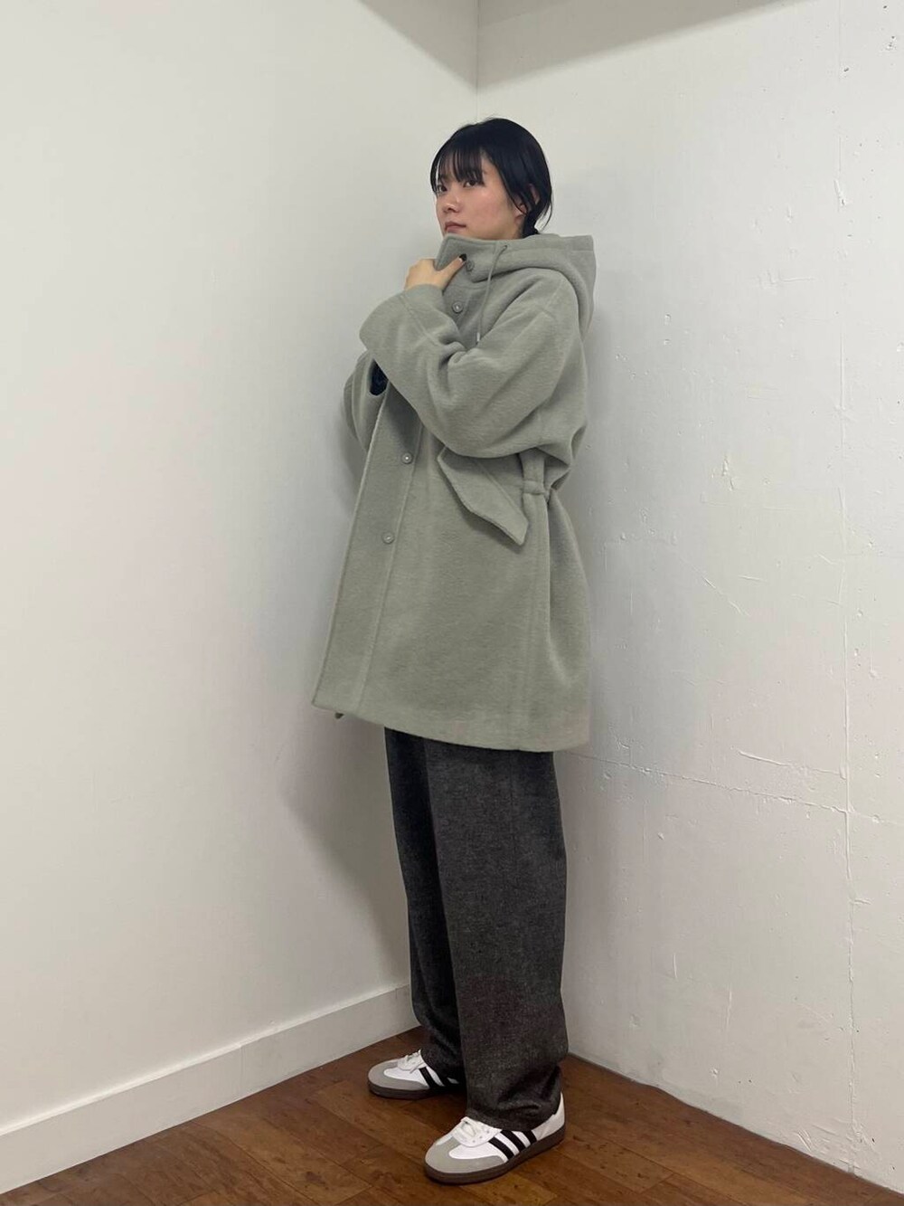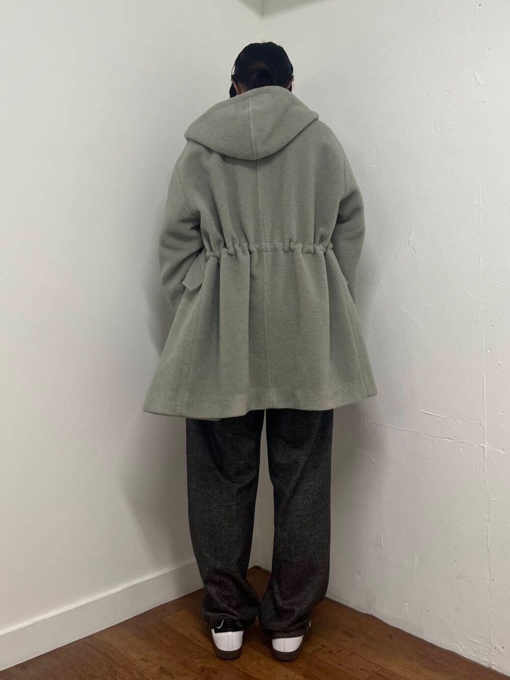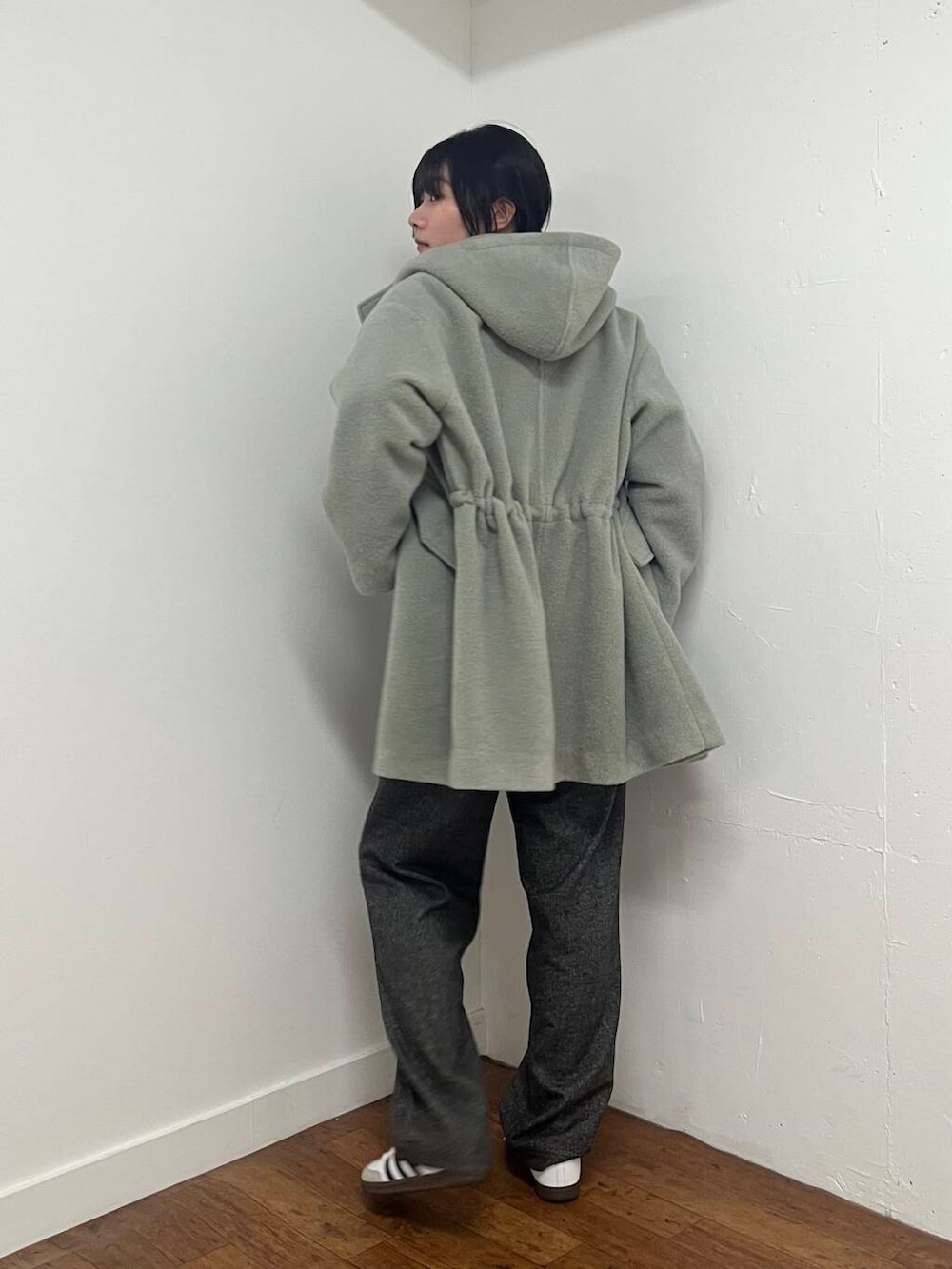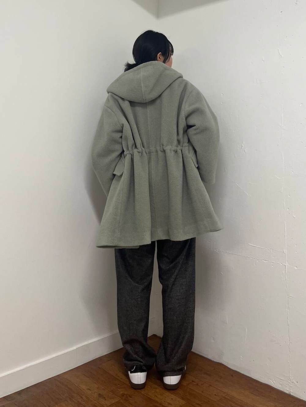 アウターを着ると着ぶくれすることが多いのですが、ループフードコートは後ろのウエストが絞れる形になっているので後ろ姿がすっきりして見えるのがうれしいポイントです!