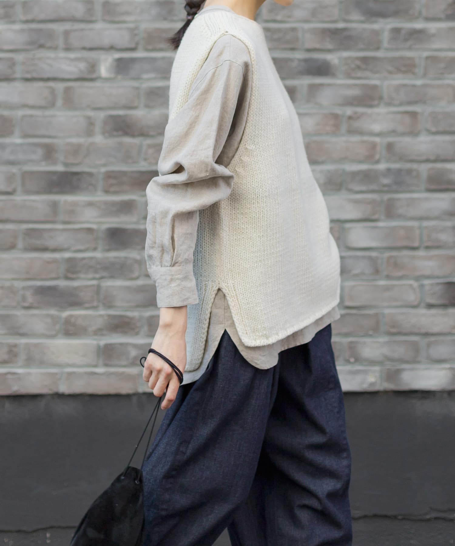 シンプルなデザインで、シャツやカットソーとのレイヤードを楽しめます。