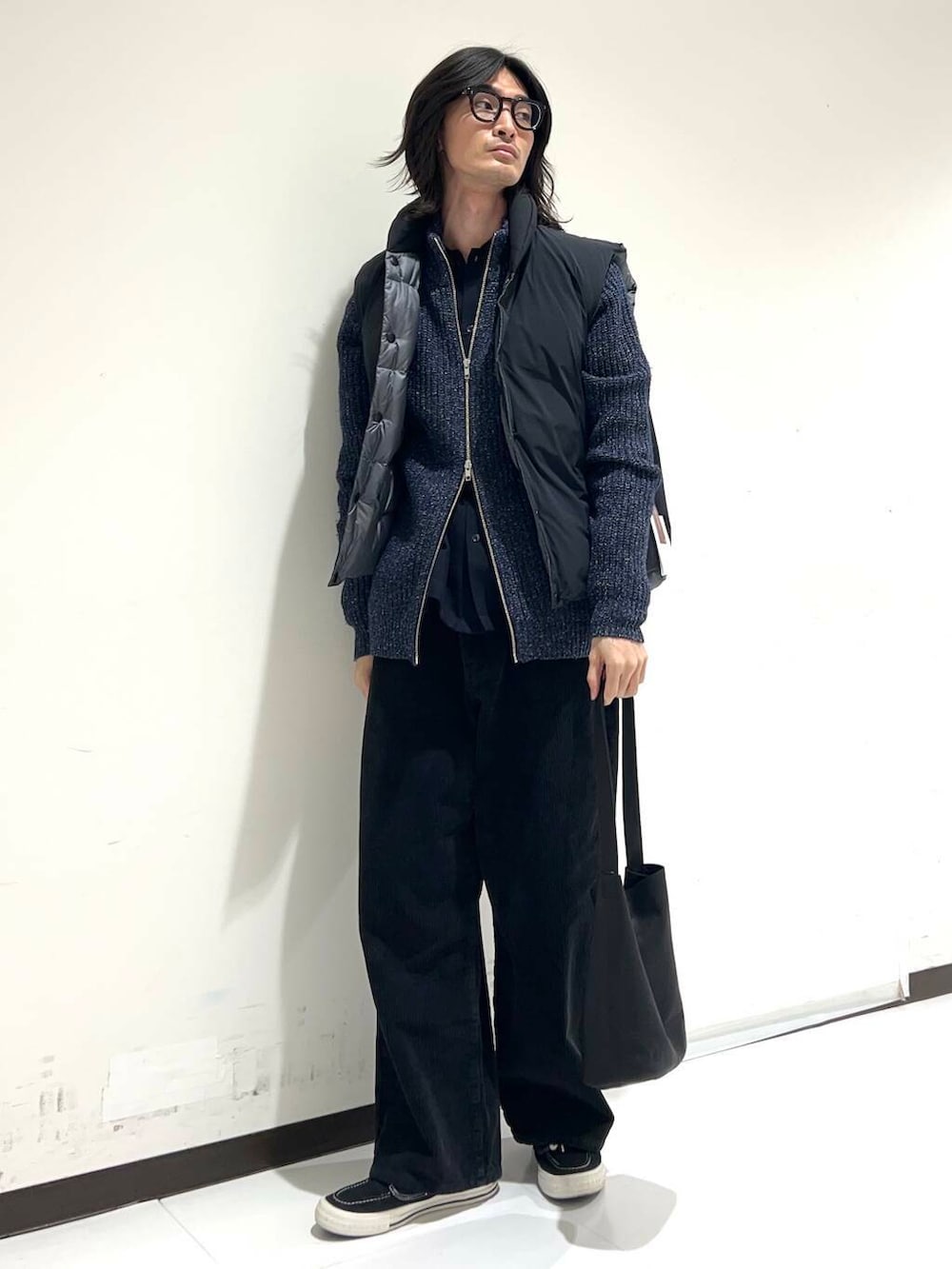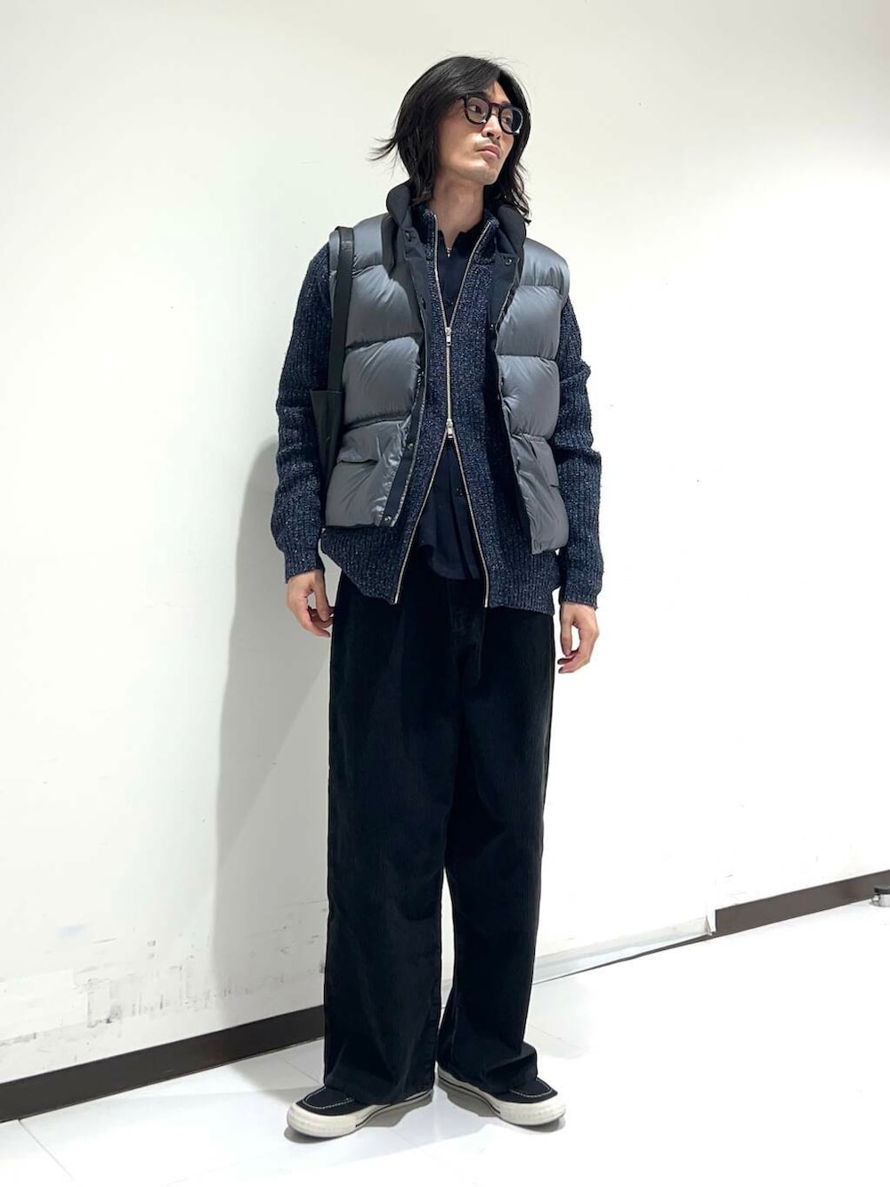 scyeのダウンベストはリバーシブル。ツヤ感のあるグレーとマットなネイビー。どちらもスタイリングの良いアクセントに役立つカラー、春先まで使える優秀アイテムです。