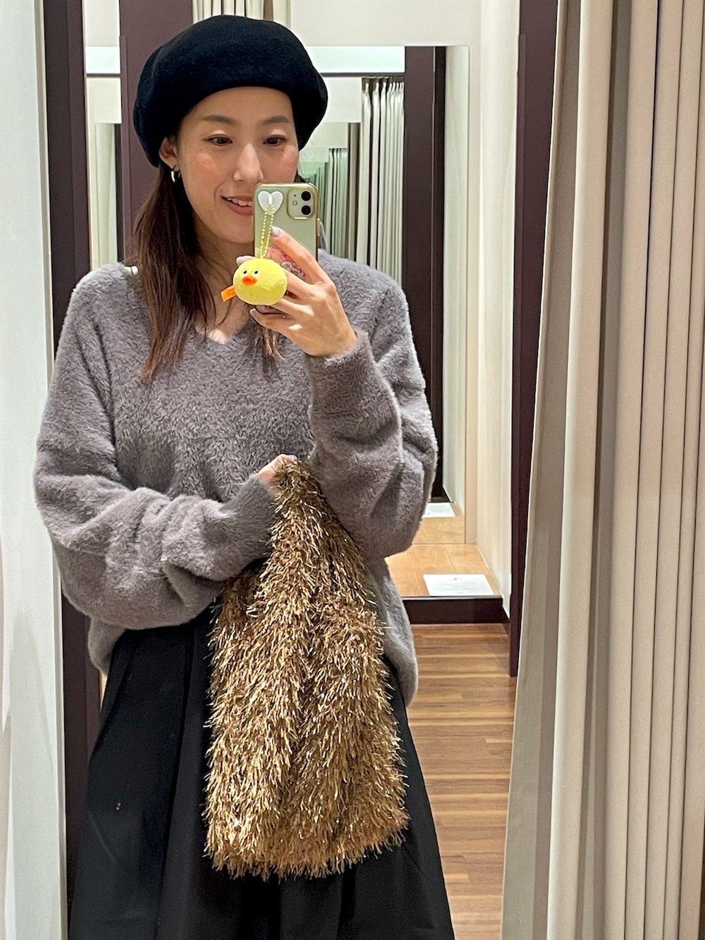 肌触り抜群のシャギーVネックニットは直接着てもまったくチクチクしないのでタンクトップやキャミソールの上にも着て頂けます‼︎