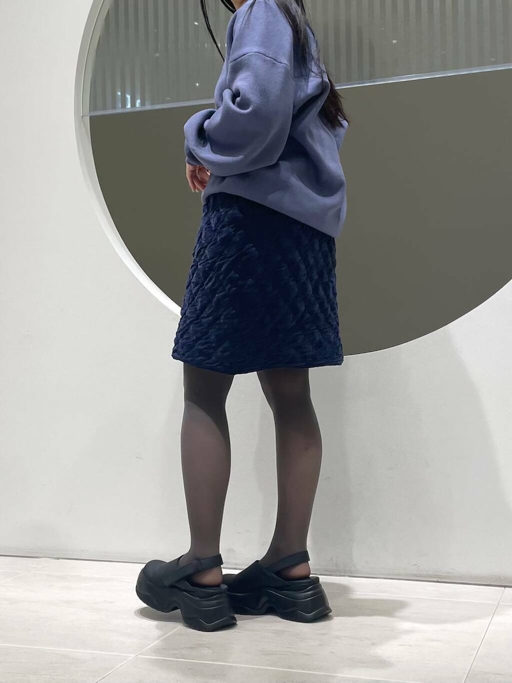 もちっとした肌触りで後ろにたまるシルエットがポイントです。カジュアル、きれいめ、どんなテイストにも合わせやすいのが◎