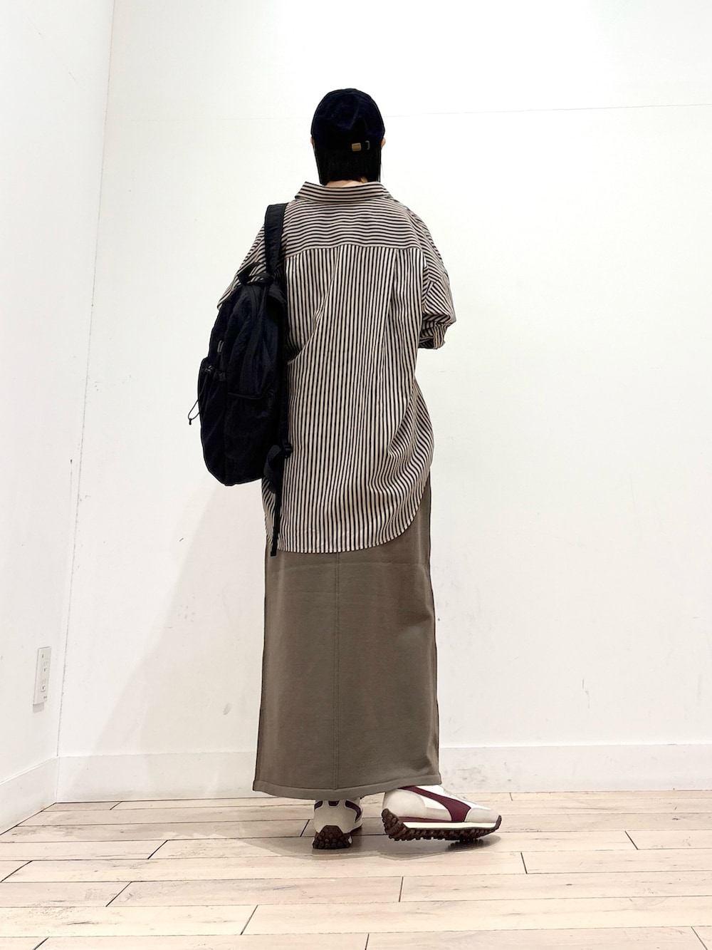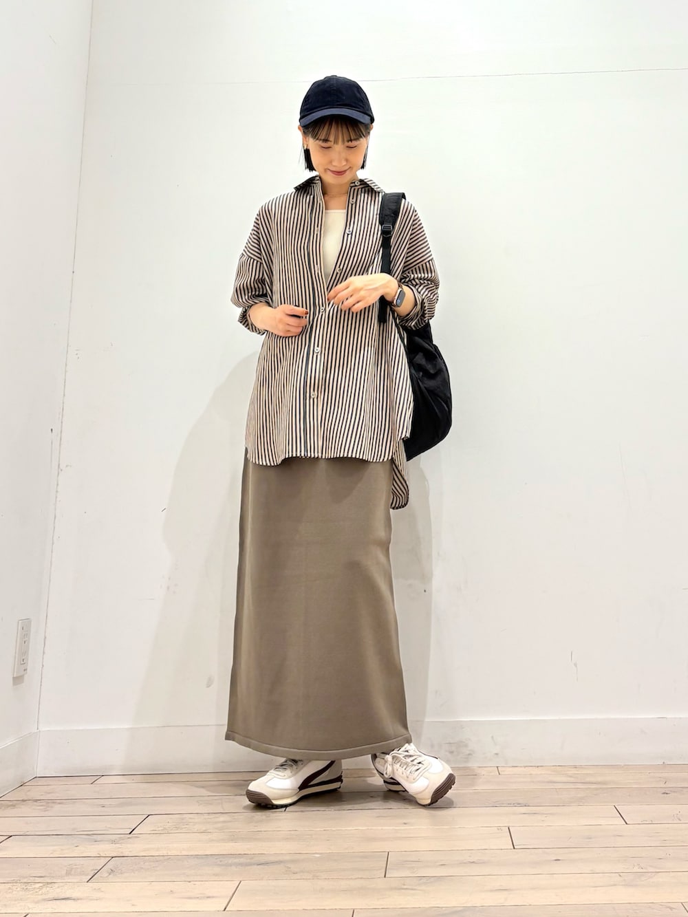 ルーズなストライプシャツは着丈が長めになっているので雰囲気のでる1枚◎