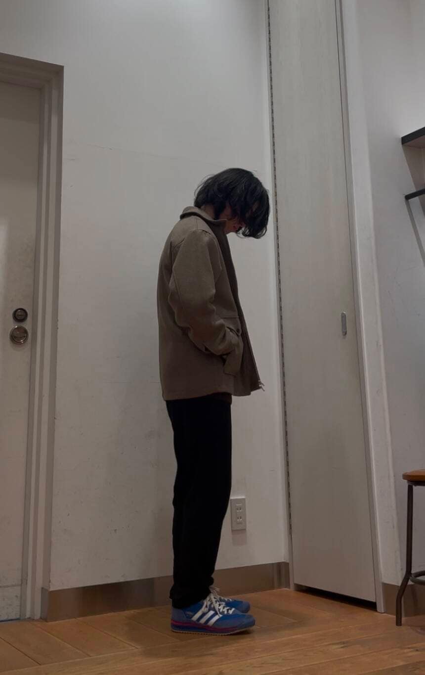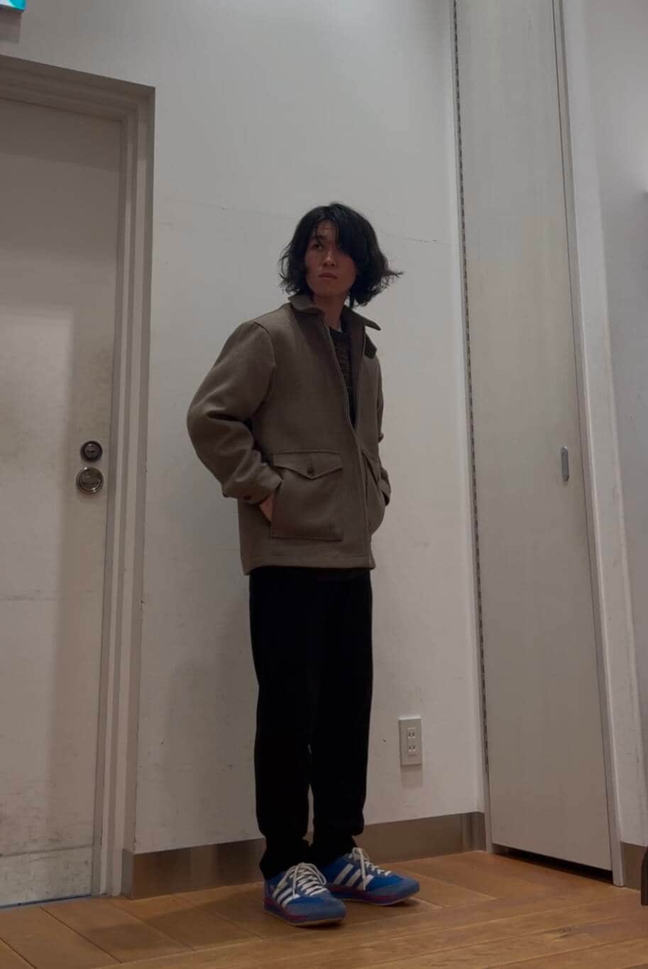 ウールブレンドハリントンジャケットを使用したコーデです。