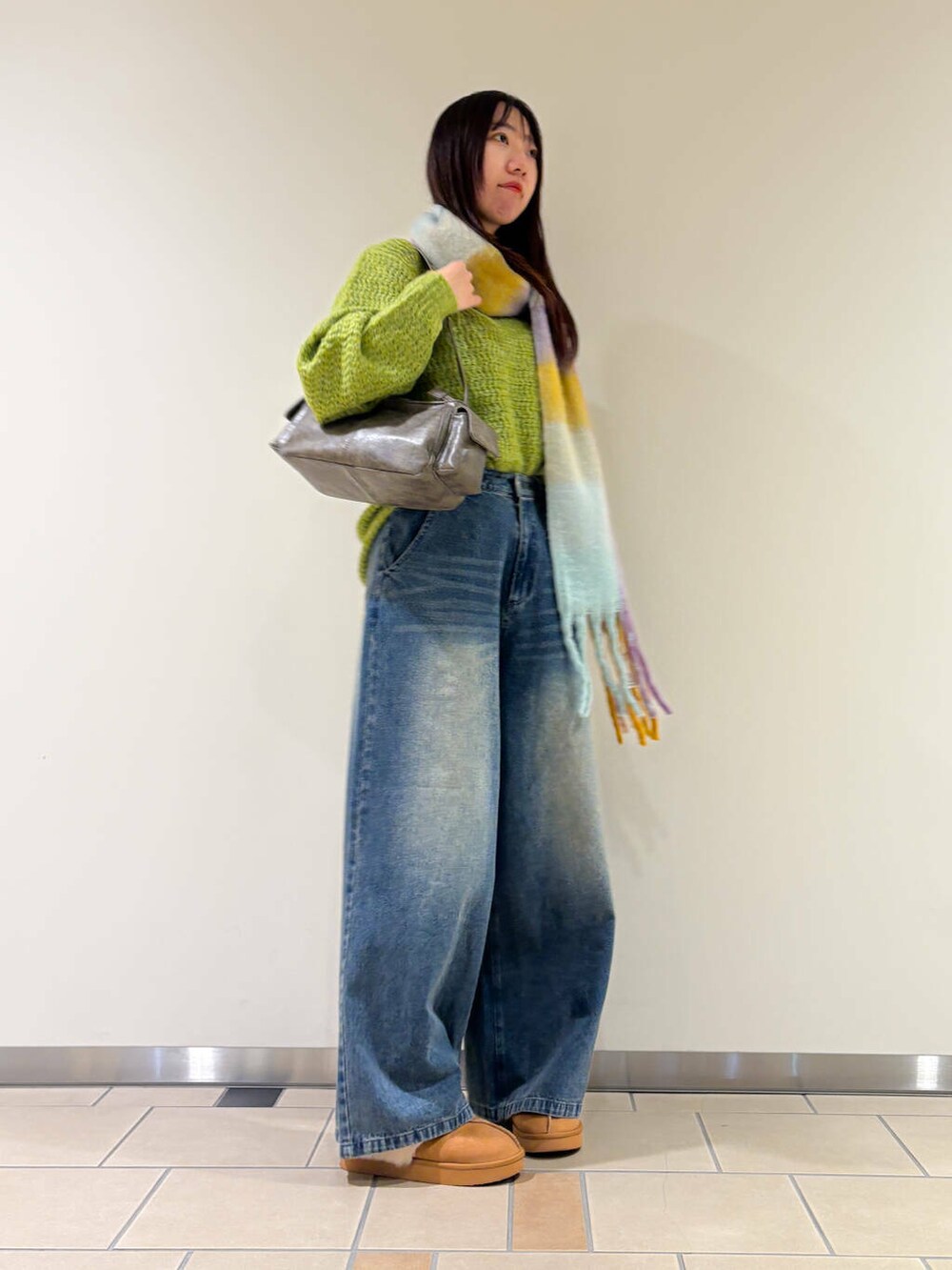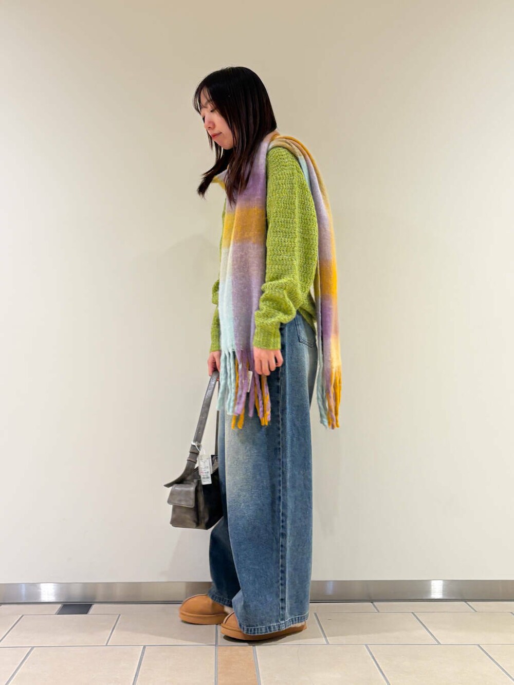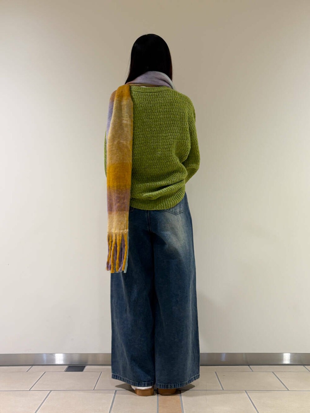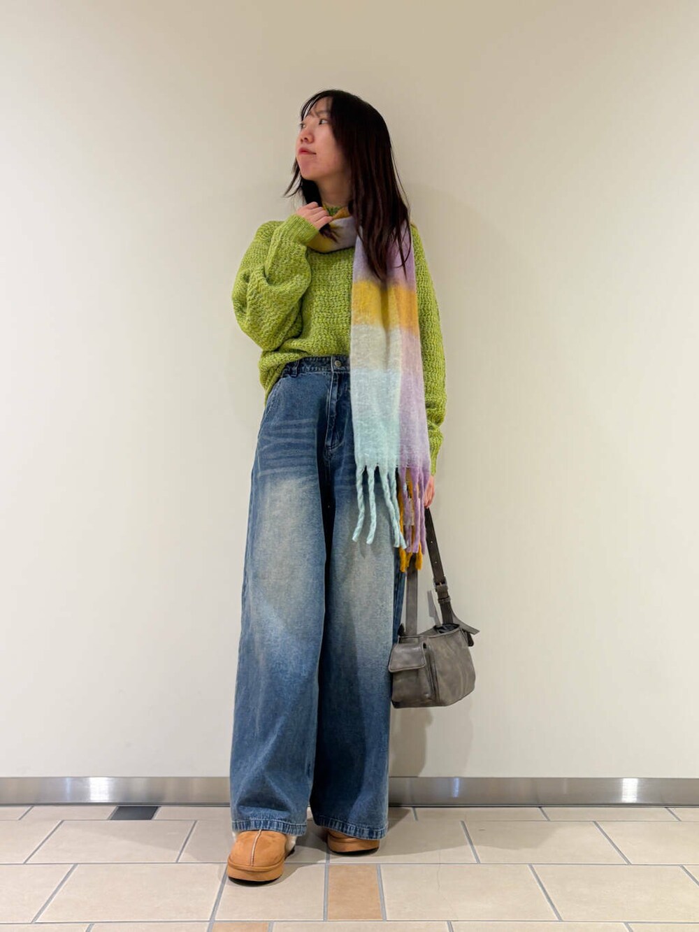 トップスにはカラバリ豊富なニットを合わせました!ローゲージでゆるっと着れるのでロンTの重ね着も楽しめそうです^^