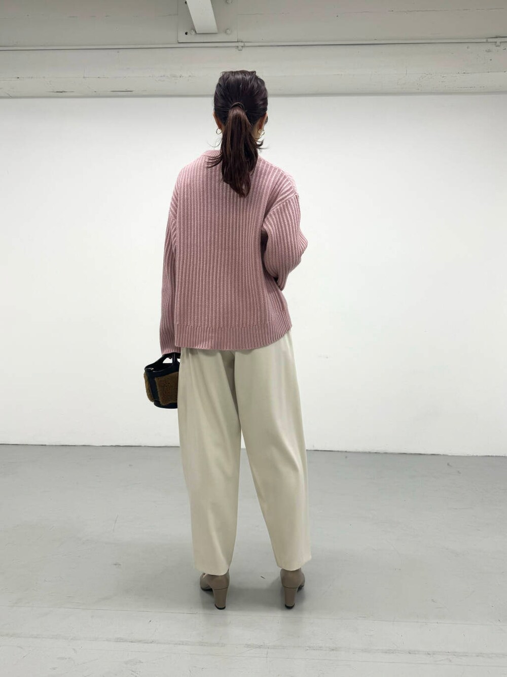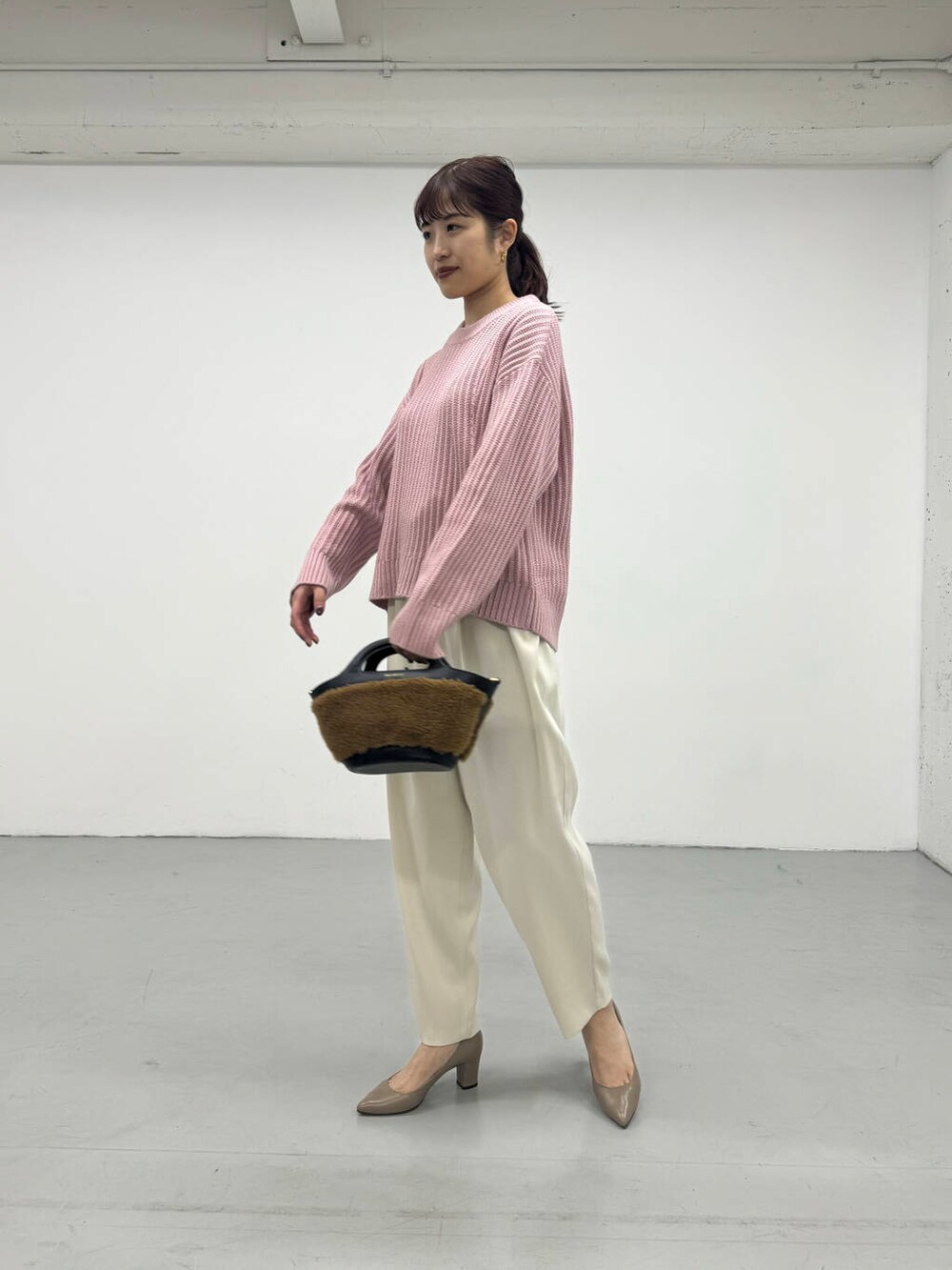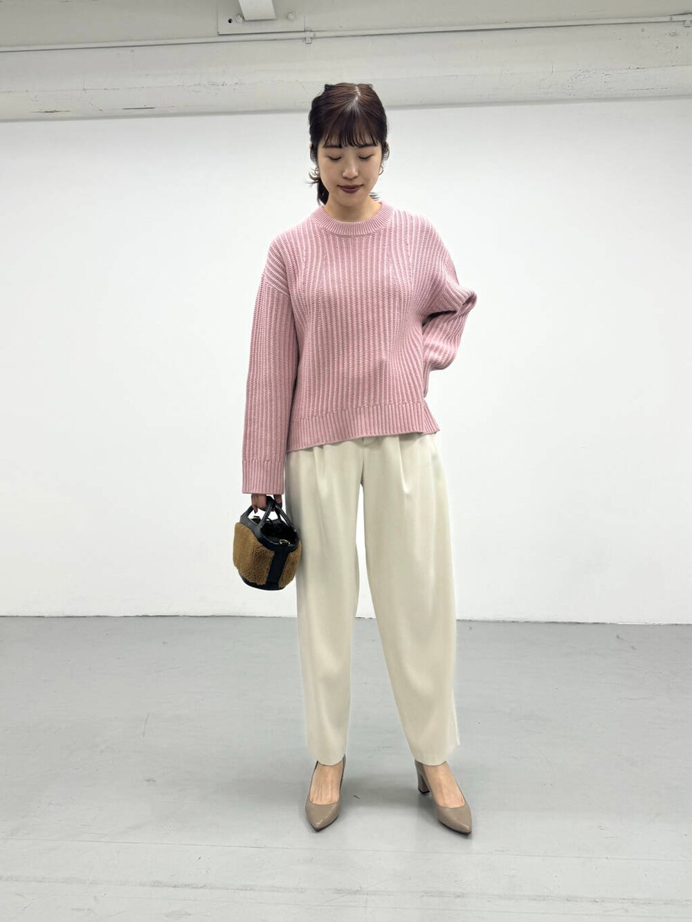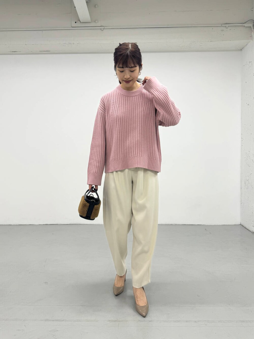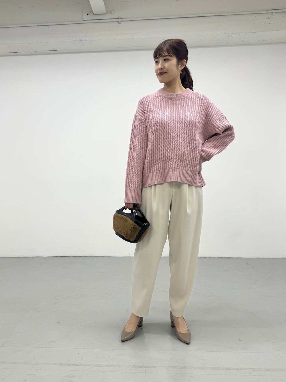 PINKカラーが目を惹く、凹凸感のあるニットを着用しました♪