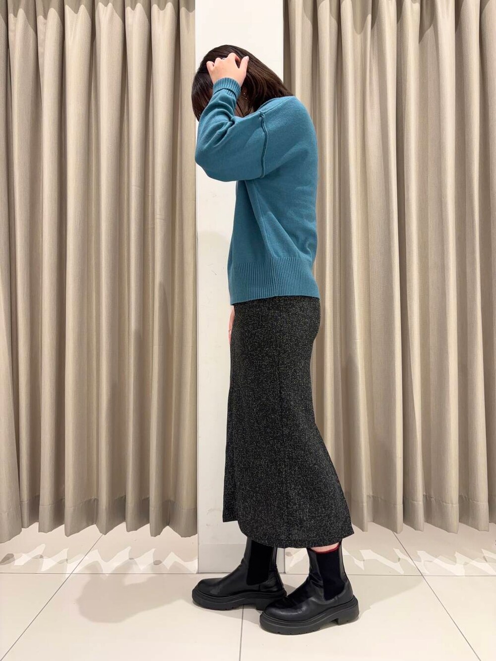 店頭でも大人気な、ジップスカートはキレイめにシンプルニットと合わせて落ち着いた大人コーデに⸜ ෆ ⸝