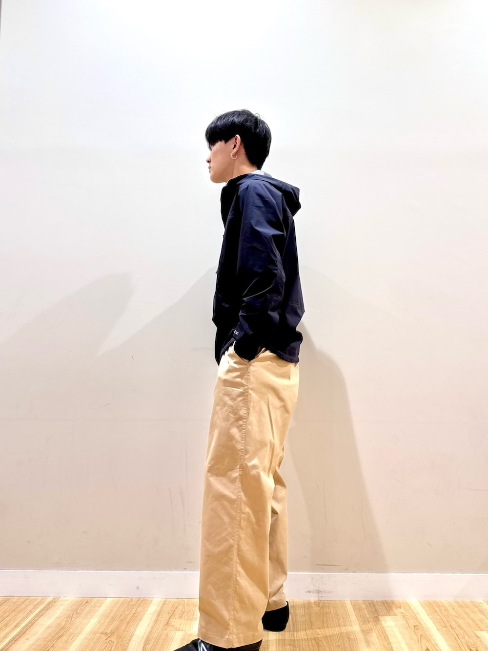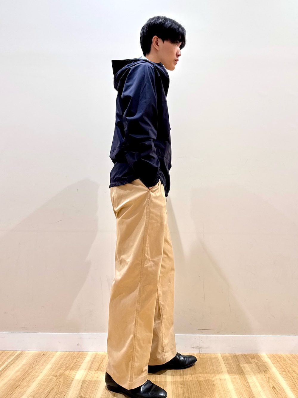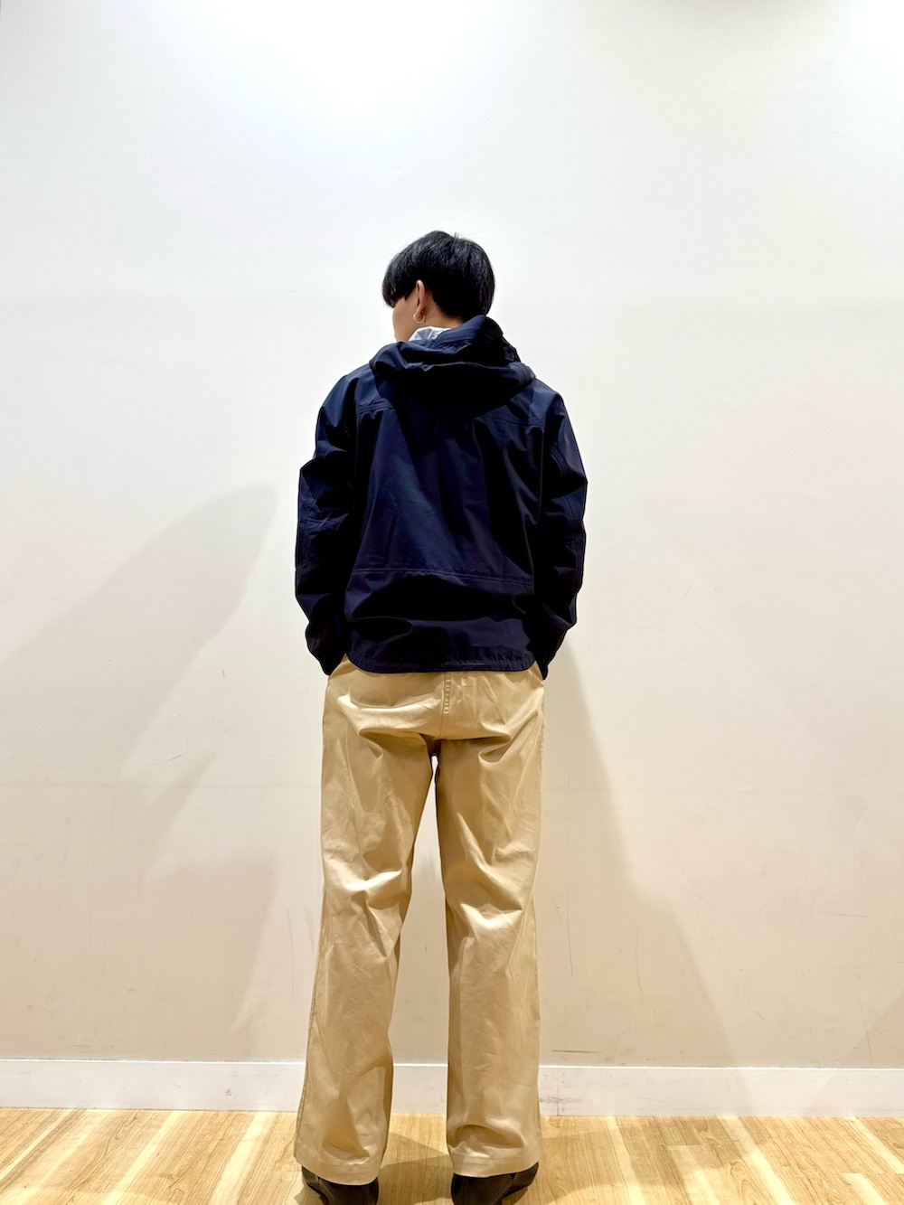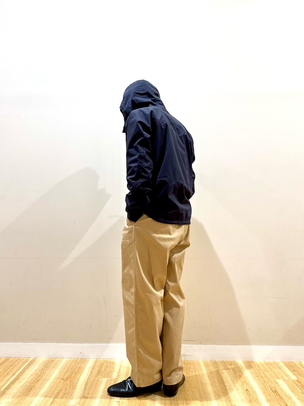 LLBEANのナイロンジャケットは撥水性、防風性が高く、すっきりしたシルエットでタウンユースにも馴染みやすいアイテムです。フードやジップのディテールがスポーティさも出してくれます。今回はチノパンで合わせましたがデニムやトラックパンツとも相性よく万能アイテムなので、気温差のある今の季節にバンバンきてください