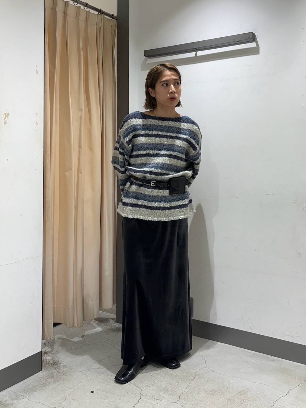 履いてみた感じ、ウエストは後ろゴムなのでゆとりのある履き心地で、丈感はベルトでウエストを上げれば裾を引きずらずに履いていただける長さでしたよᵕ ᵕ ♡