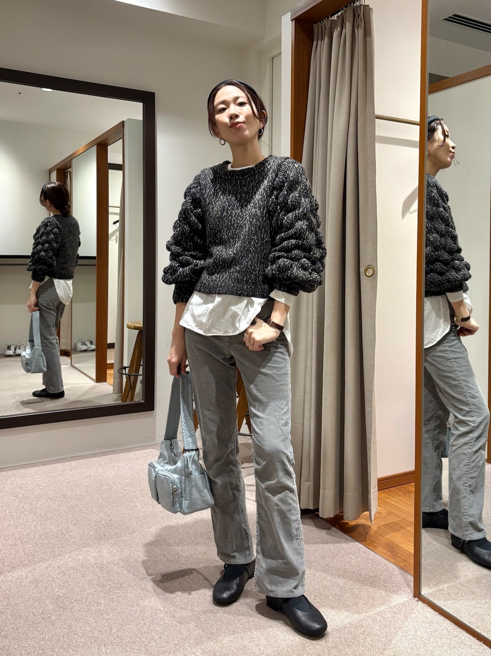 上がシンプルなアイテムだと少し寂しくなるので個性ドライバーズニットを合わせ下のZipを開ける事で抜け感を出しています!