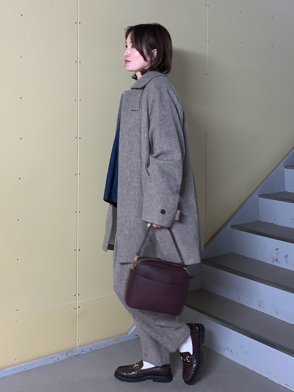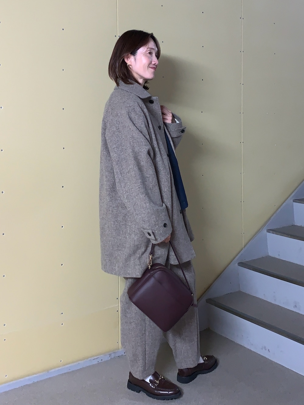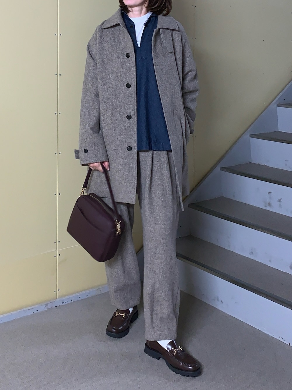 重い生地ですが、シルエットのたわみがたまらなく可愛い💕アウターもパンツも裏地がしっかりあるので、チクチクとは無縁です。