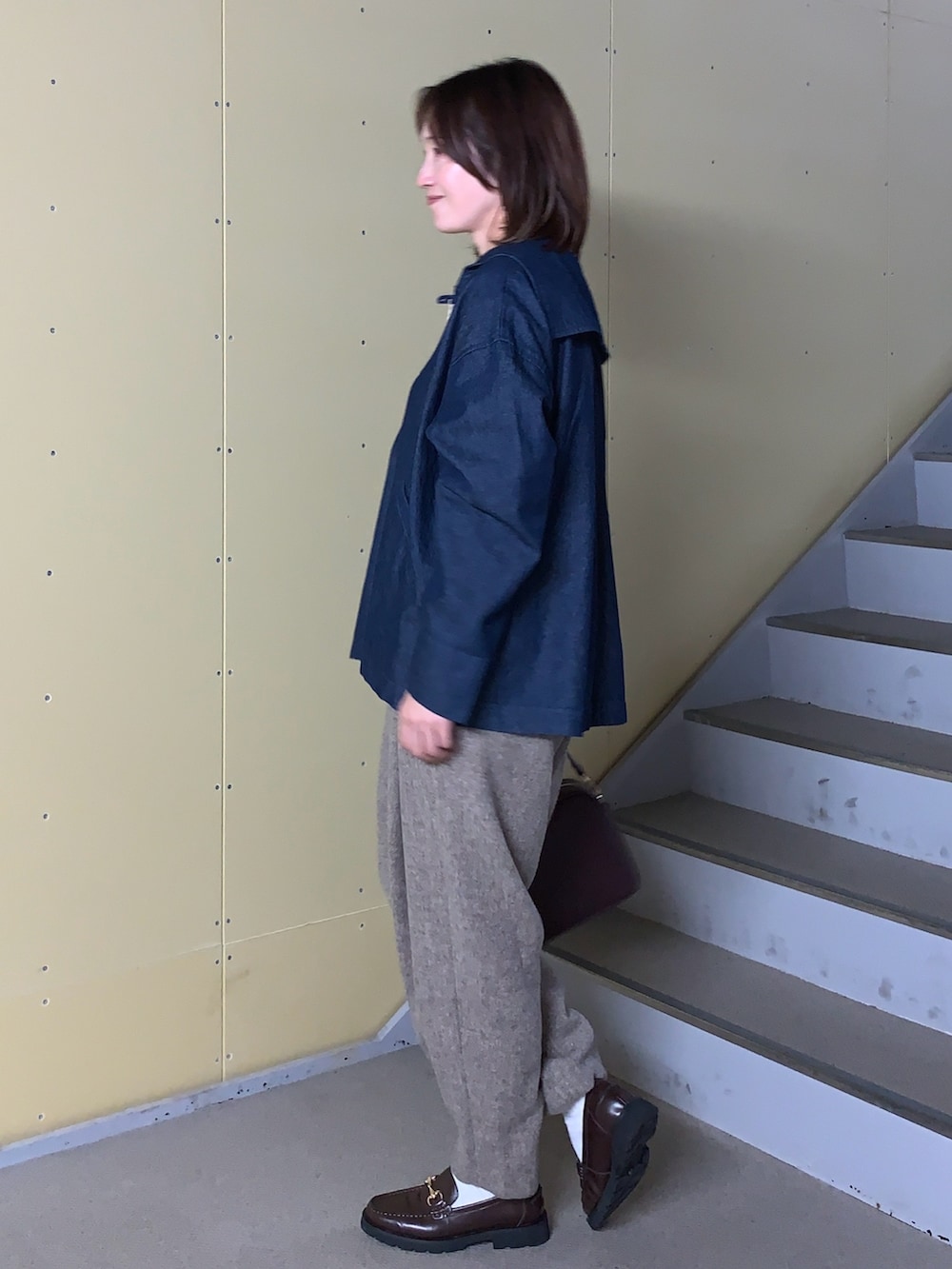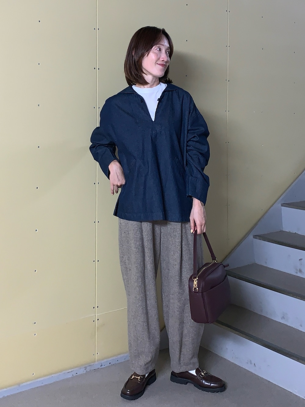 インナーのデニムセーラープルオーバーも、コクーンなシルエットパンツと相性抜群です✨