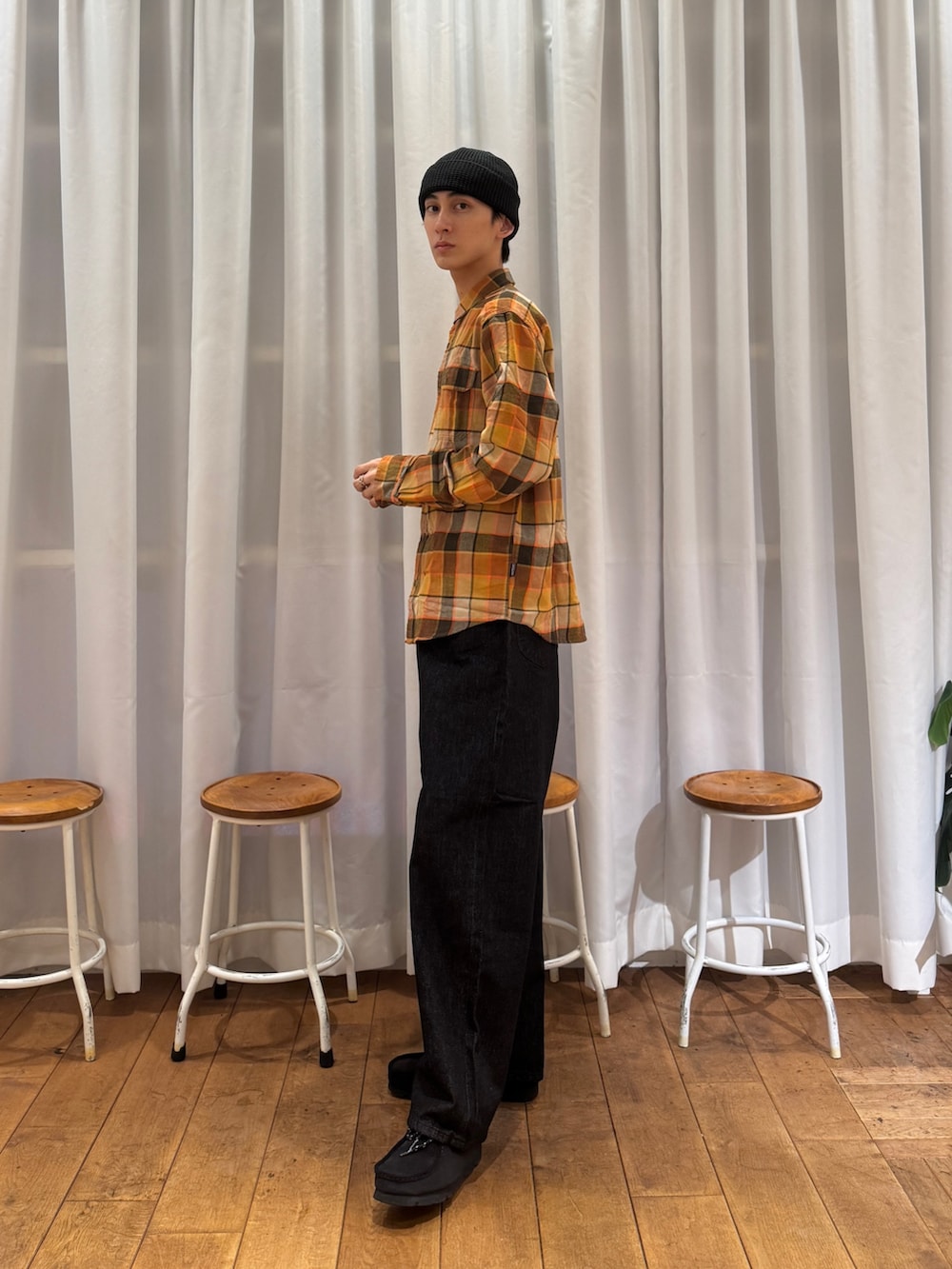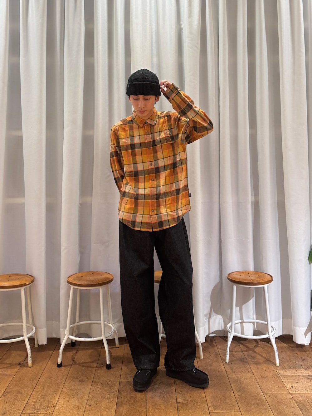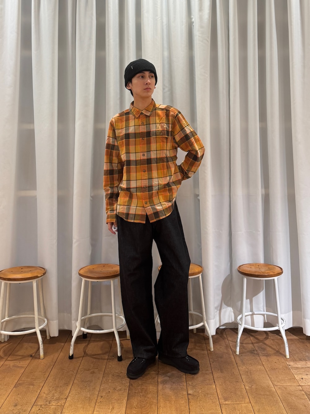 パンツ、シューズ、ビーニーにブラックを選び、全体を引き締めてシャツの存在感を引き立てました✔︎︎︎︎