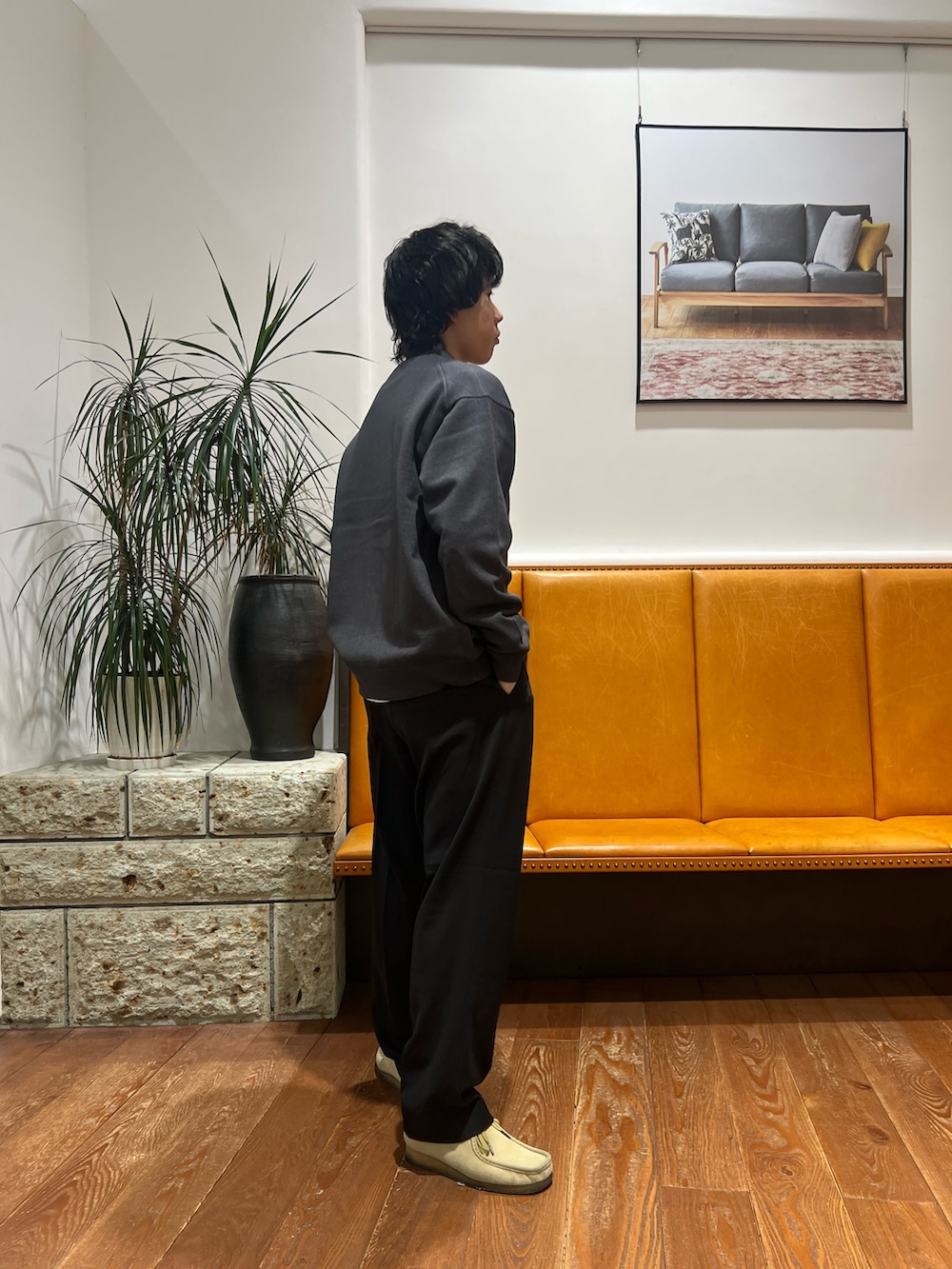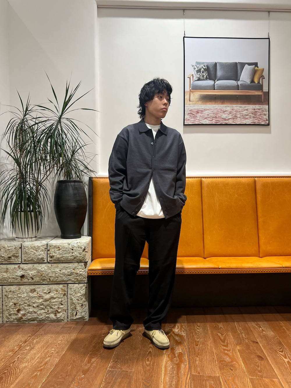 ゆとりのあるシルエットでゆるさを出しつつ2タックのパンツで綺麗めに仕上げることのできるバランスの取れたコーデになります