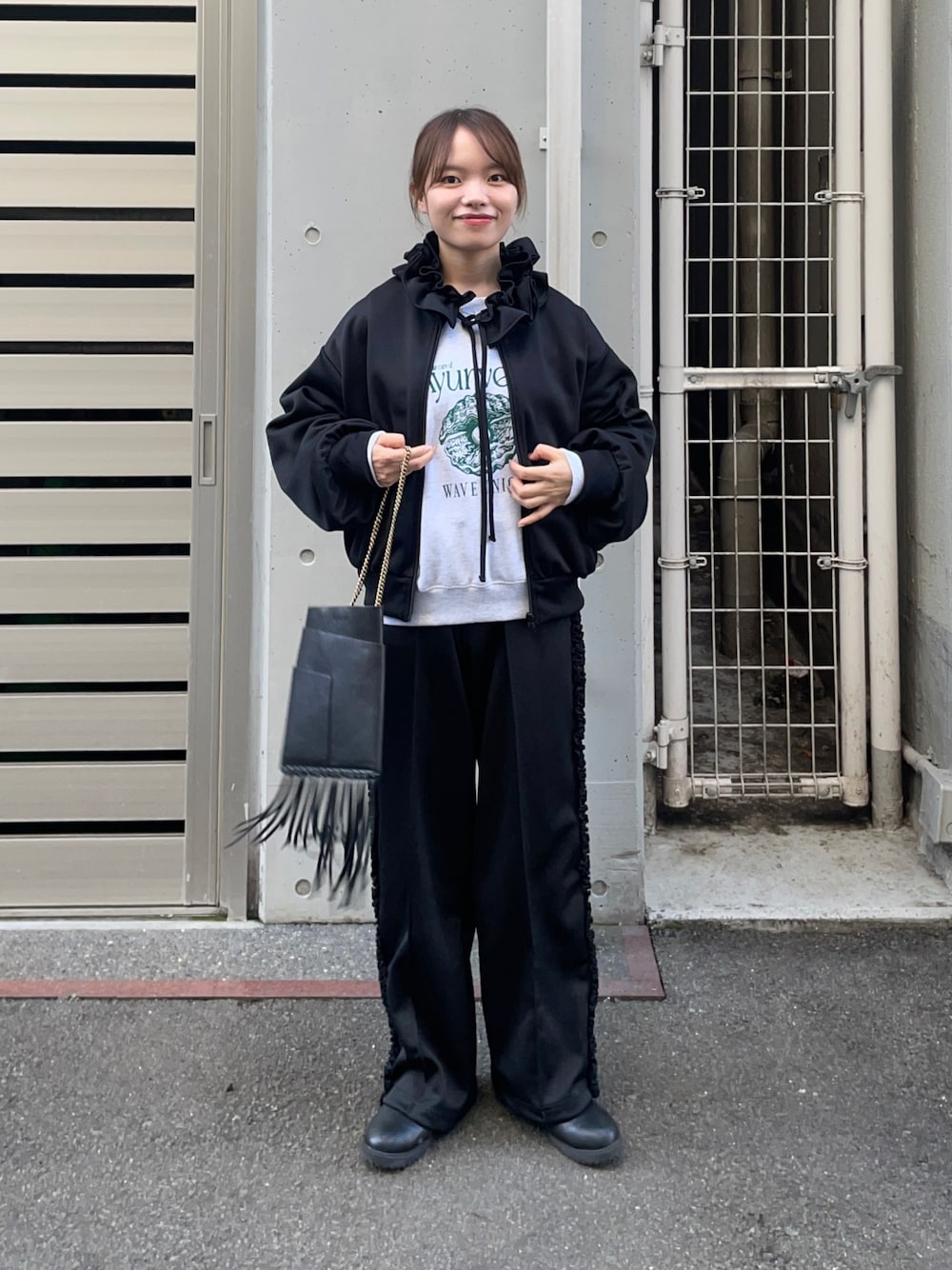 パンツはウール混のギャザーワイドパンツで、ウエストがゴムの楽ちんアイテムです!ゴム紐でウエスト調節も可能ですよ!私はリアルバイしたので、8センチカットしました!濃ゆいグレーがどんなトップスにもあってオススメです!