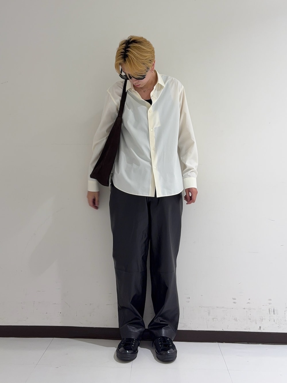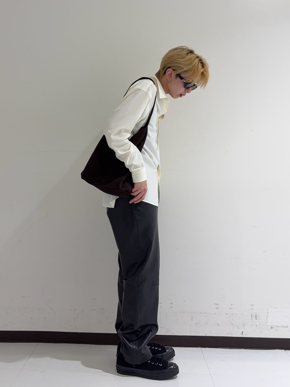 このレザーパンツは少しワイドなのでシャツなどに合わせると抜け感が出ておすすめです。