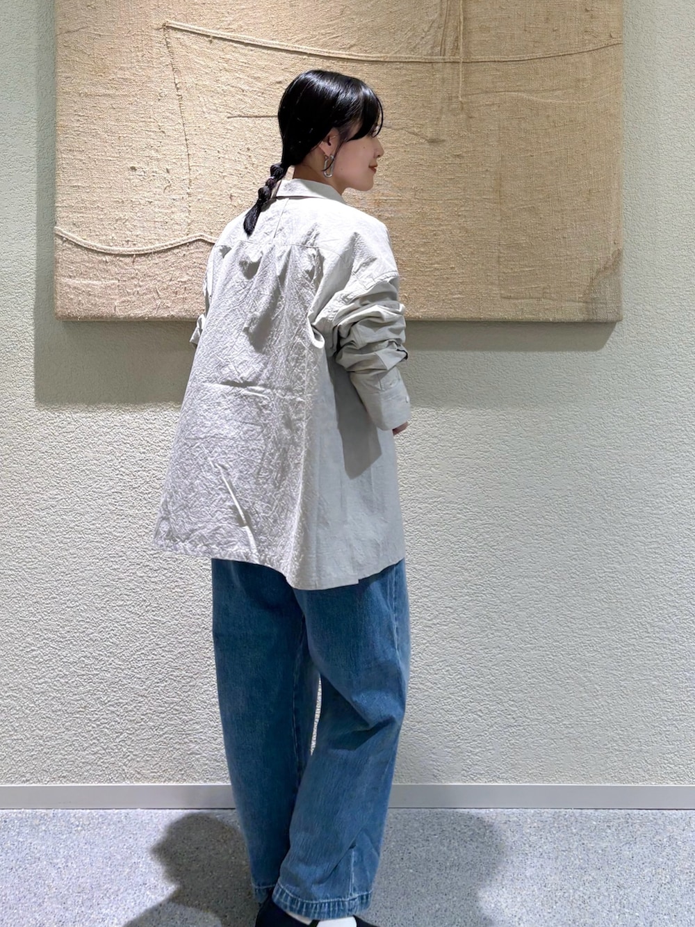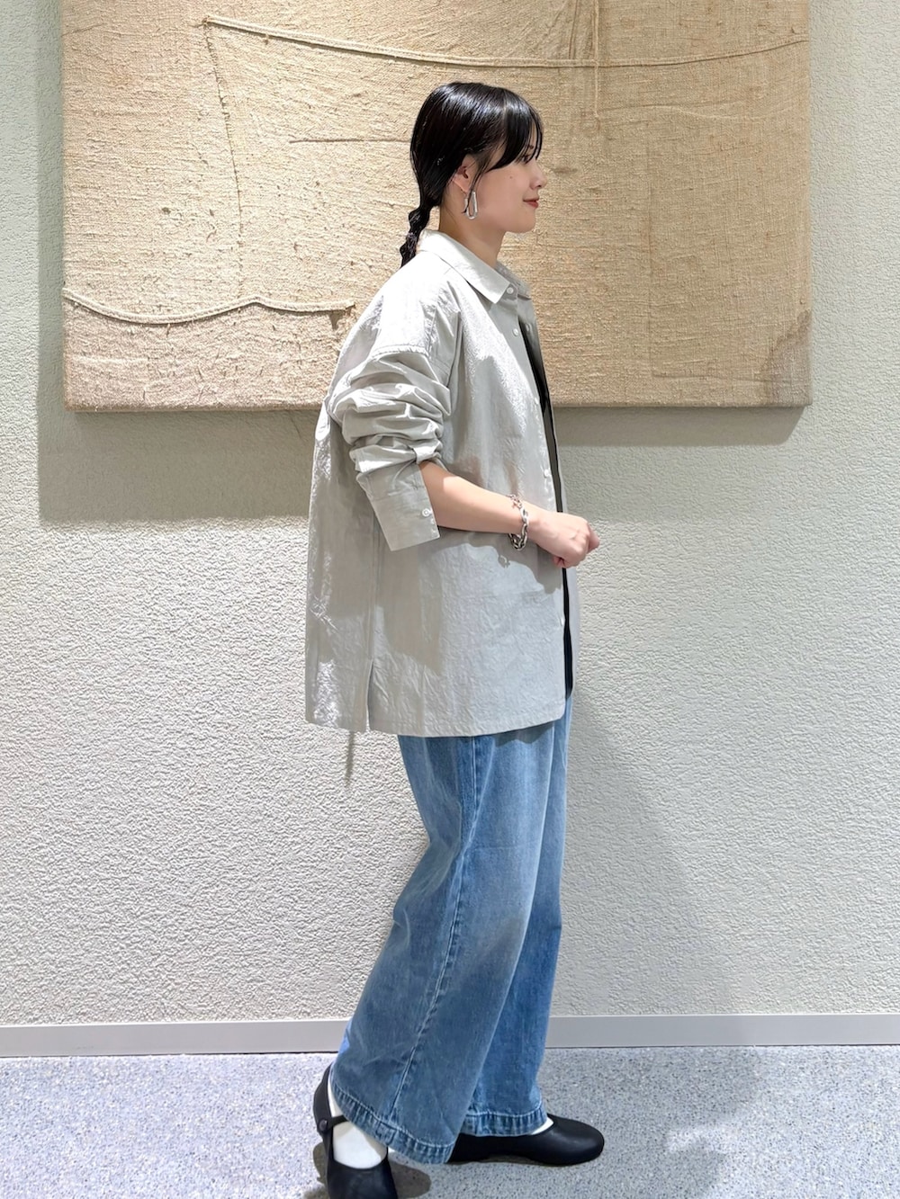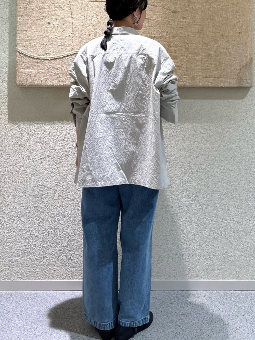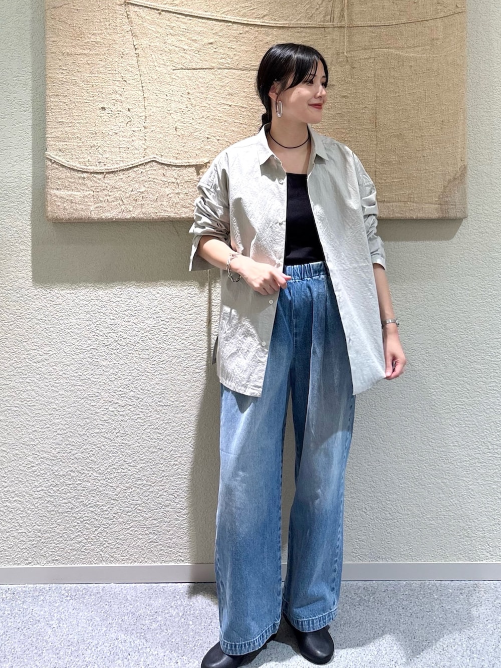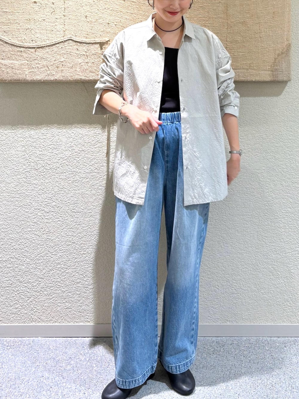 シンプルで着回し力の高いレギュラーカラーのシャツ。ややボックスシルエットで、羽織りとしても使えるデザインです。今回はボタンを開けてラフに羽織り、リラックス感を演出。