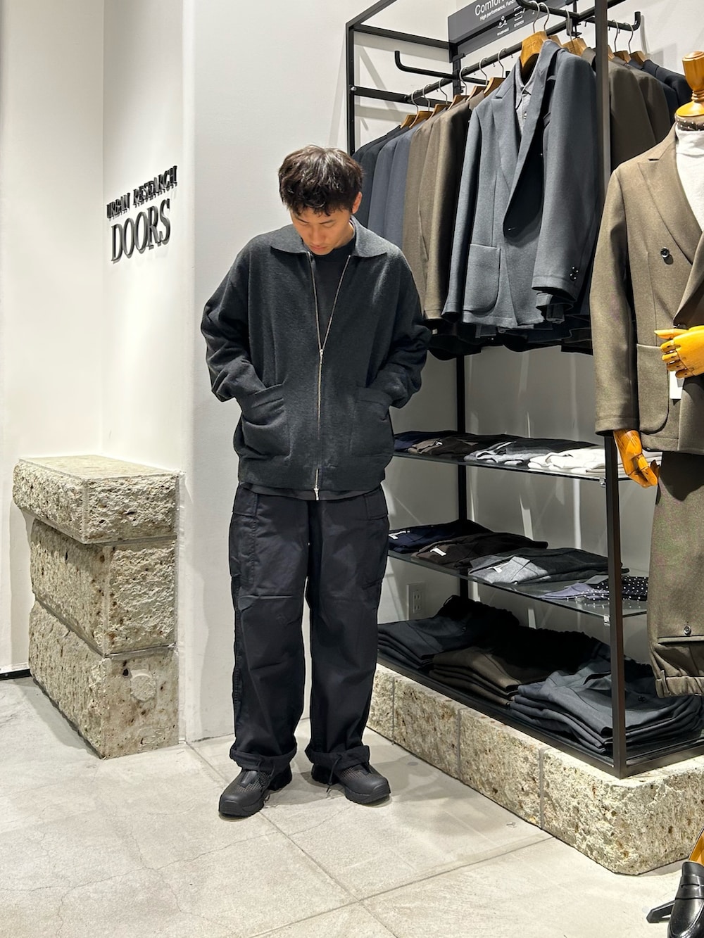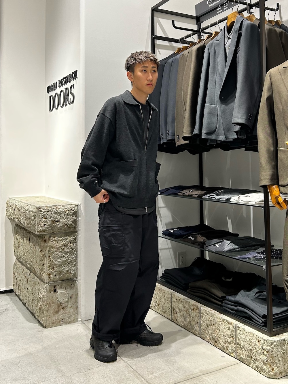 トップス、ボトムスはワンサイズ上を着用することで、とことん黒色の重さを強調させています。