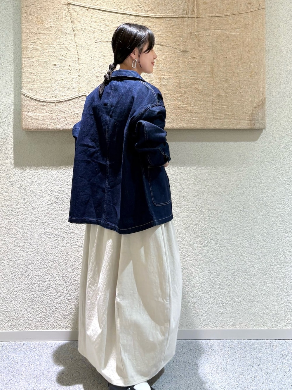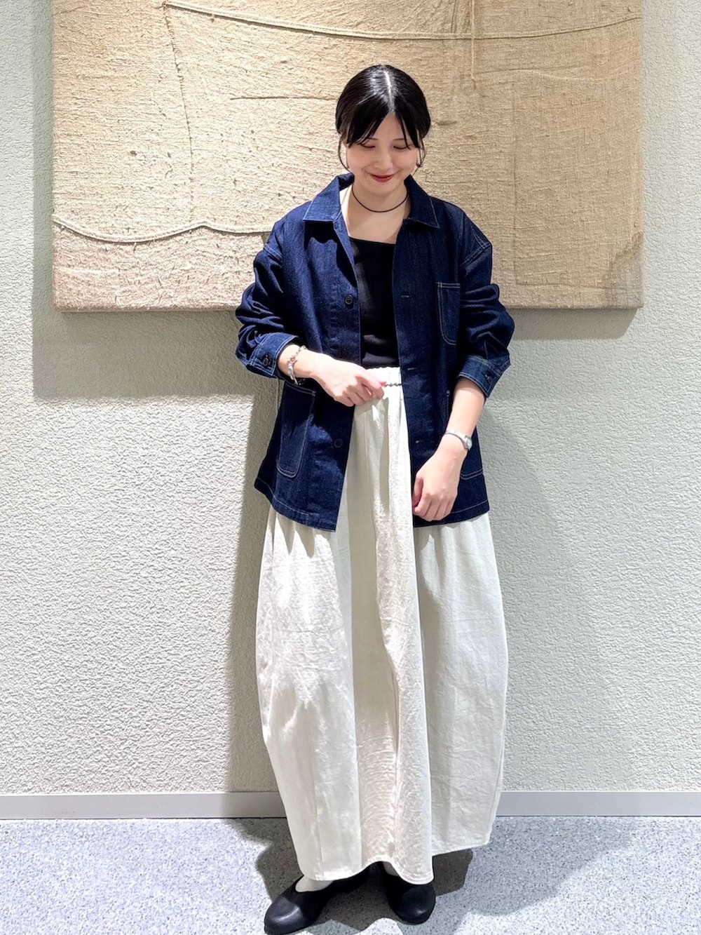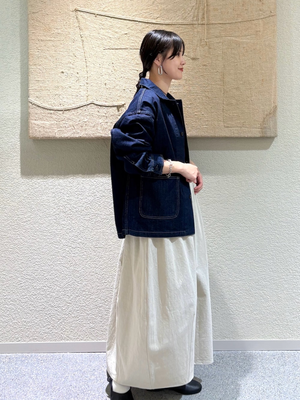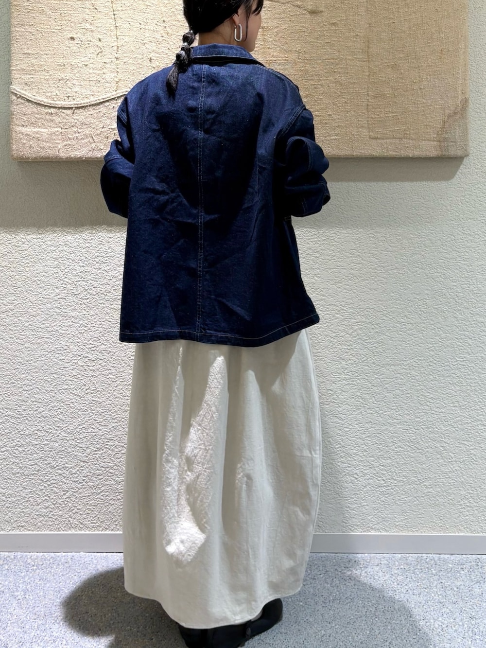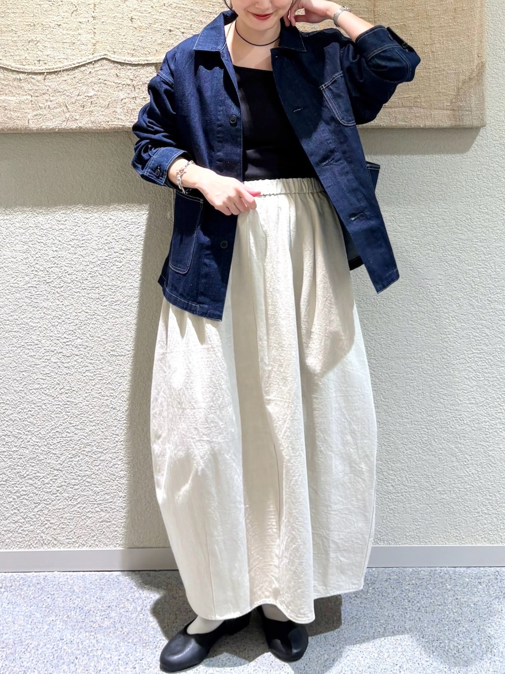 ・デニムカバーオールでワーク感を出しつつ、スカートで女性らしさをバランスよく演出