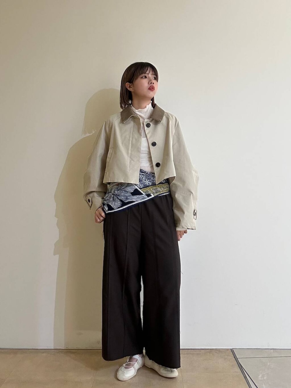 ショート丈のアウターで脚長効果にもなり、パンツはゴムなので楽ちんです^^