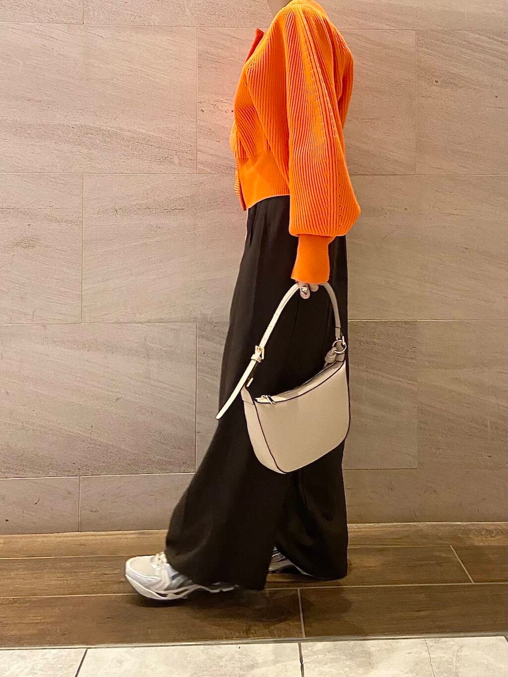 可愛らしい印象なのでダメージのスラックスとスニーカーでカジュアルに◎