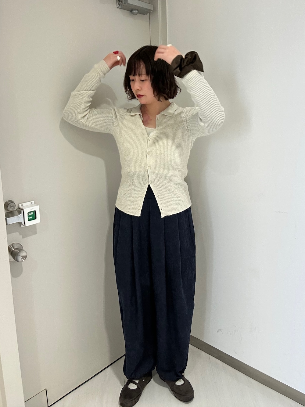 オフショルになるくらい襟がざっくり開いているので、レースのトップスを合わせて肌見せを抑えめにしました!