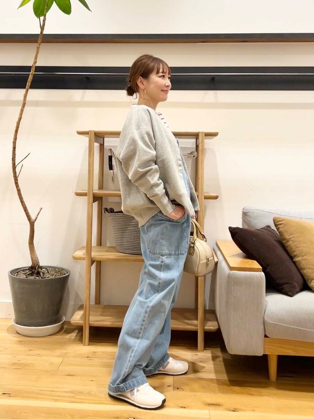 店頭でも大人気でご試着が絶えないアイテム、裏起毛スウェットカーディガンを羽織ってます。