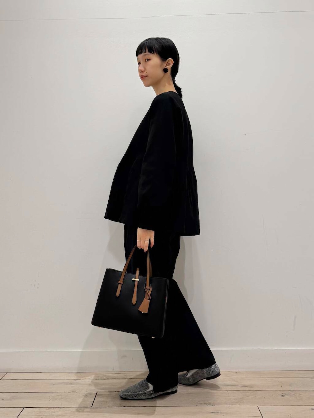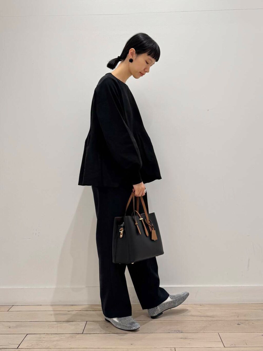 トップス、BLACKで見づらいのが申し訳ないのですが、ウエストから少し高い位置から広がっているので腰回りをカバーしてくれます◎