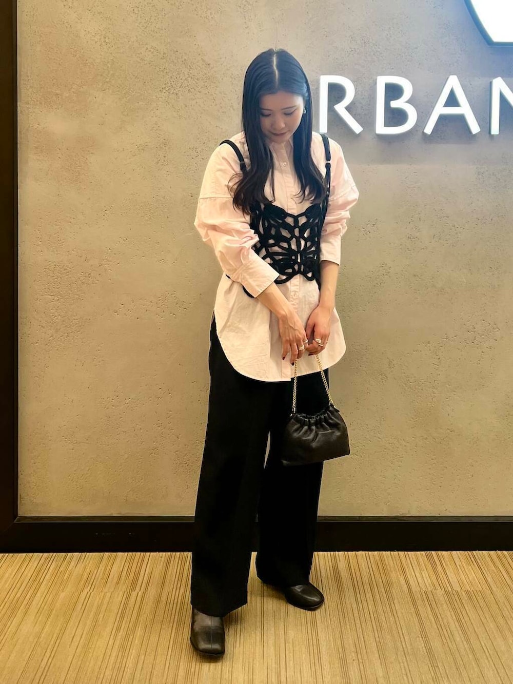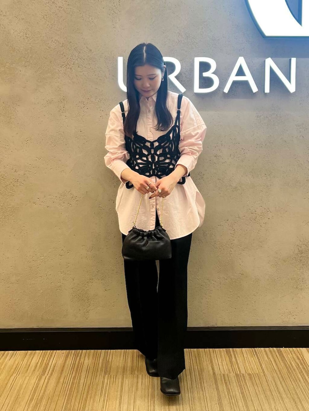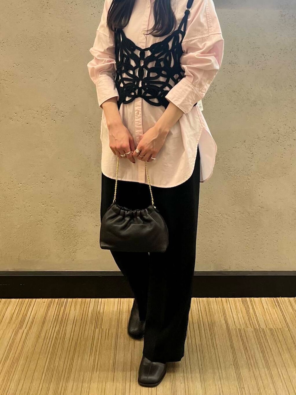 ピンクのシャツで春の季節感がでるので、ブラック合わせでも可愛いです✨