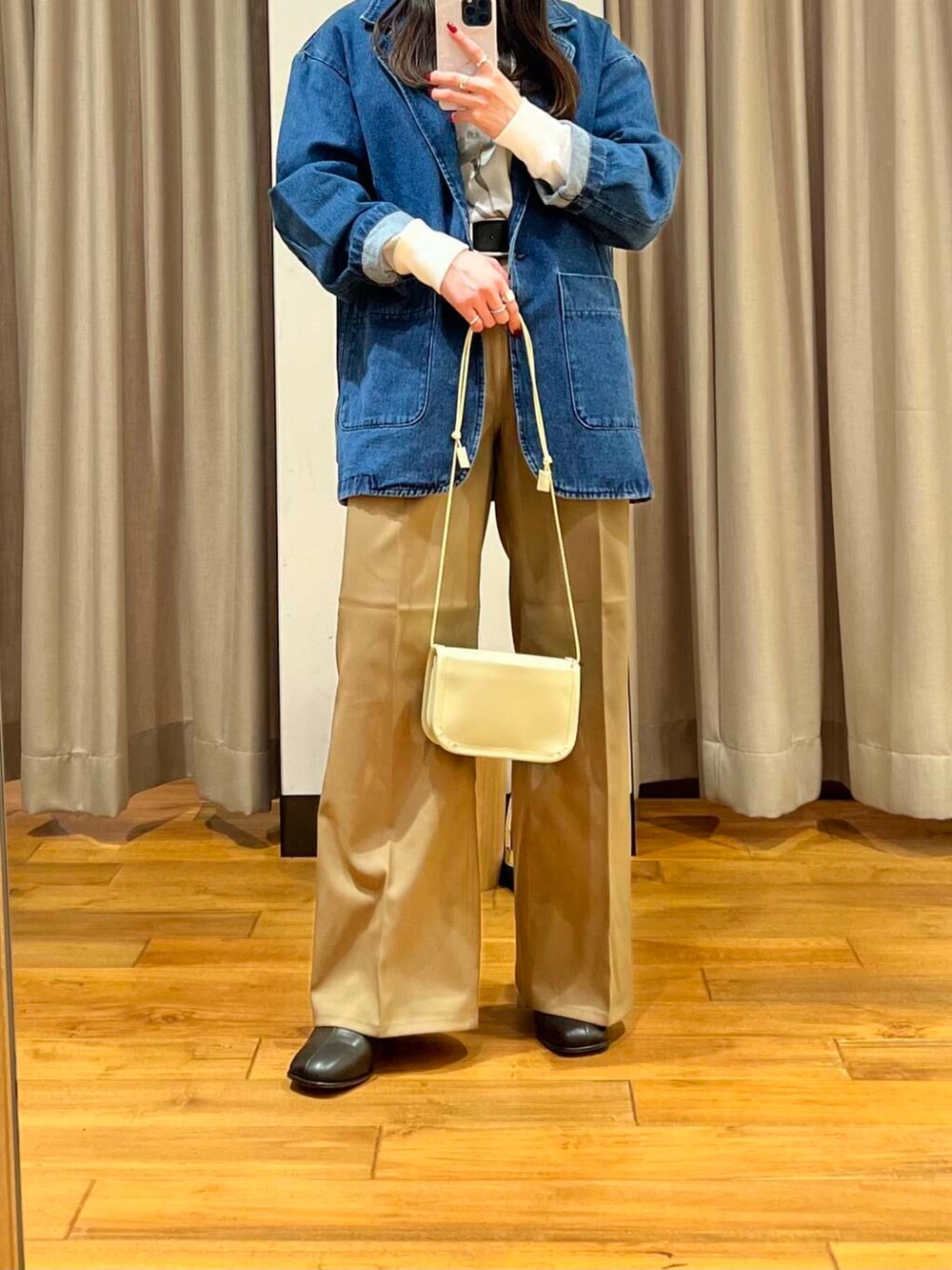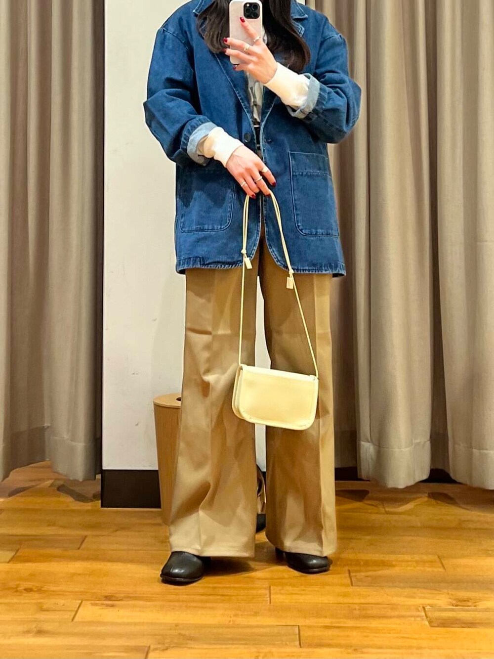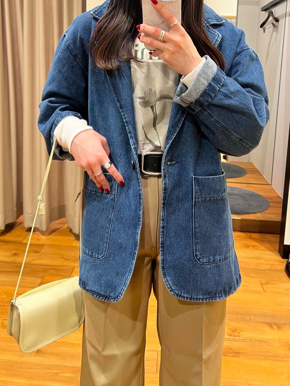 ボトムスはラングラーのパンツで、シルエットがきれいなのに、ストレッチ性もあり、シワになりにくい素材で、おすすめパンツです✨
