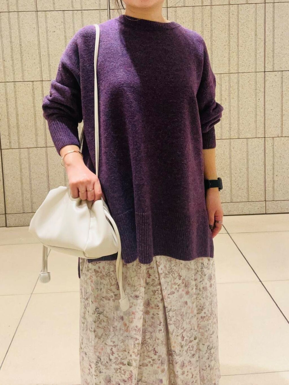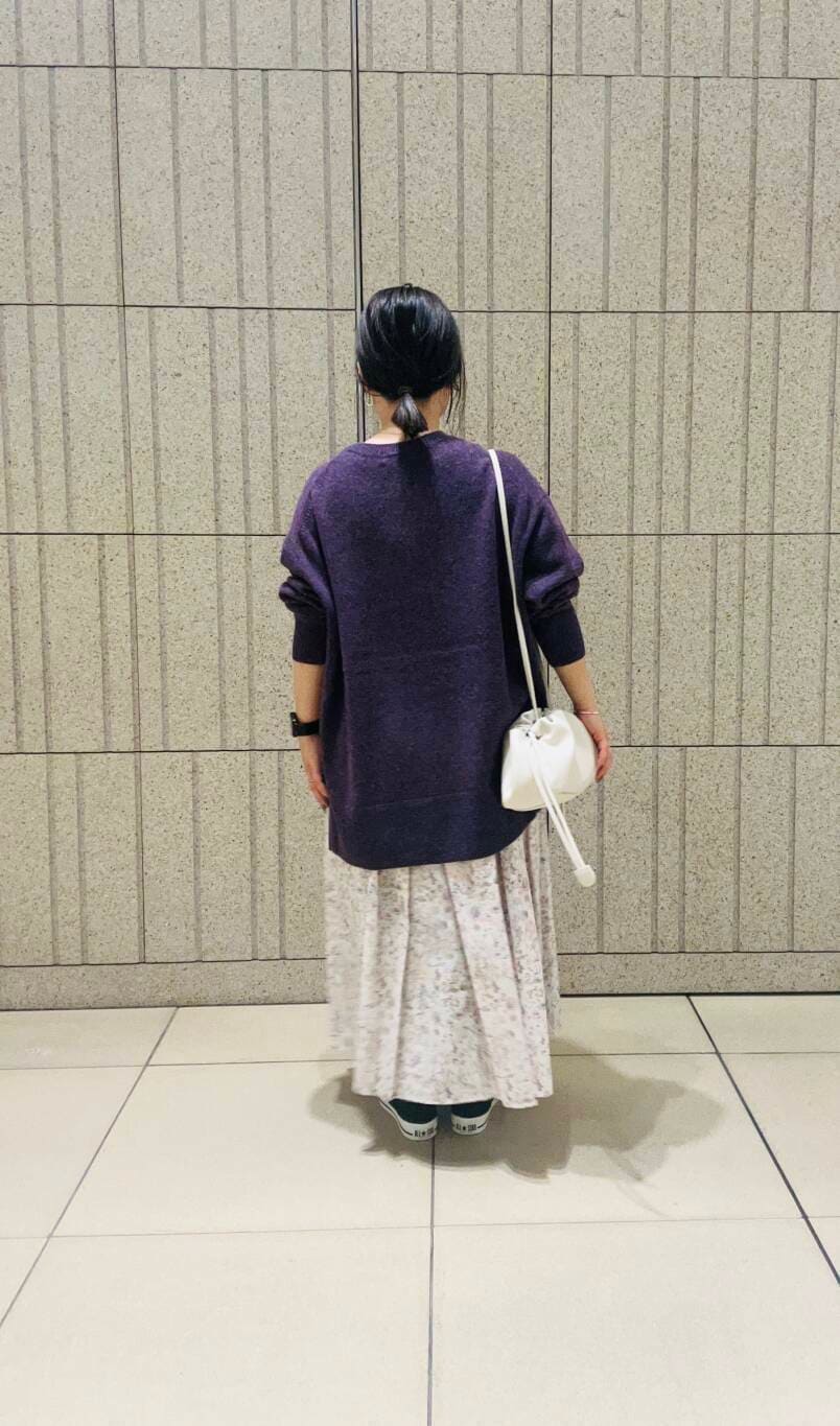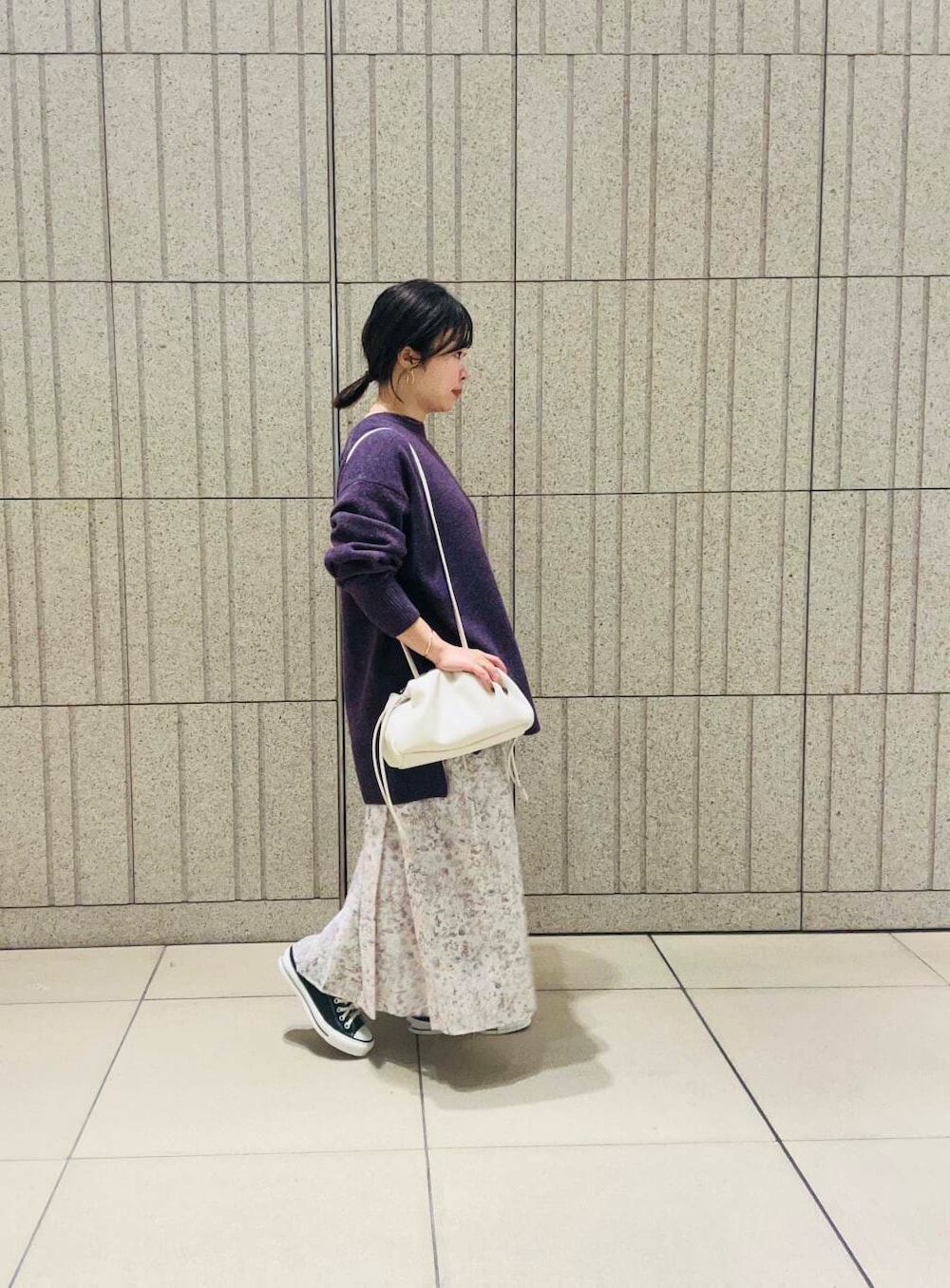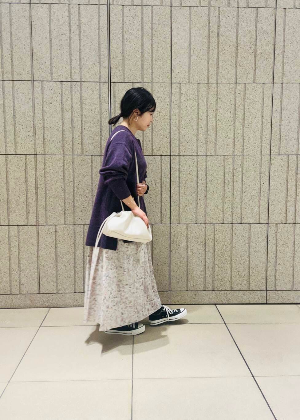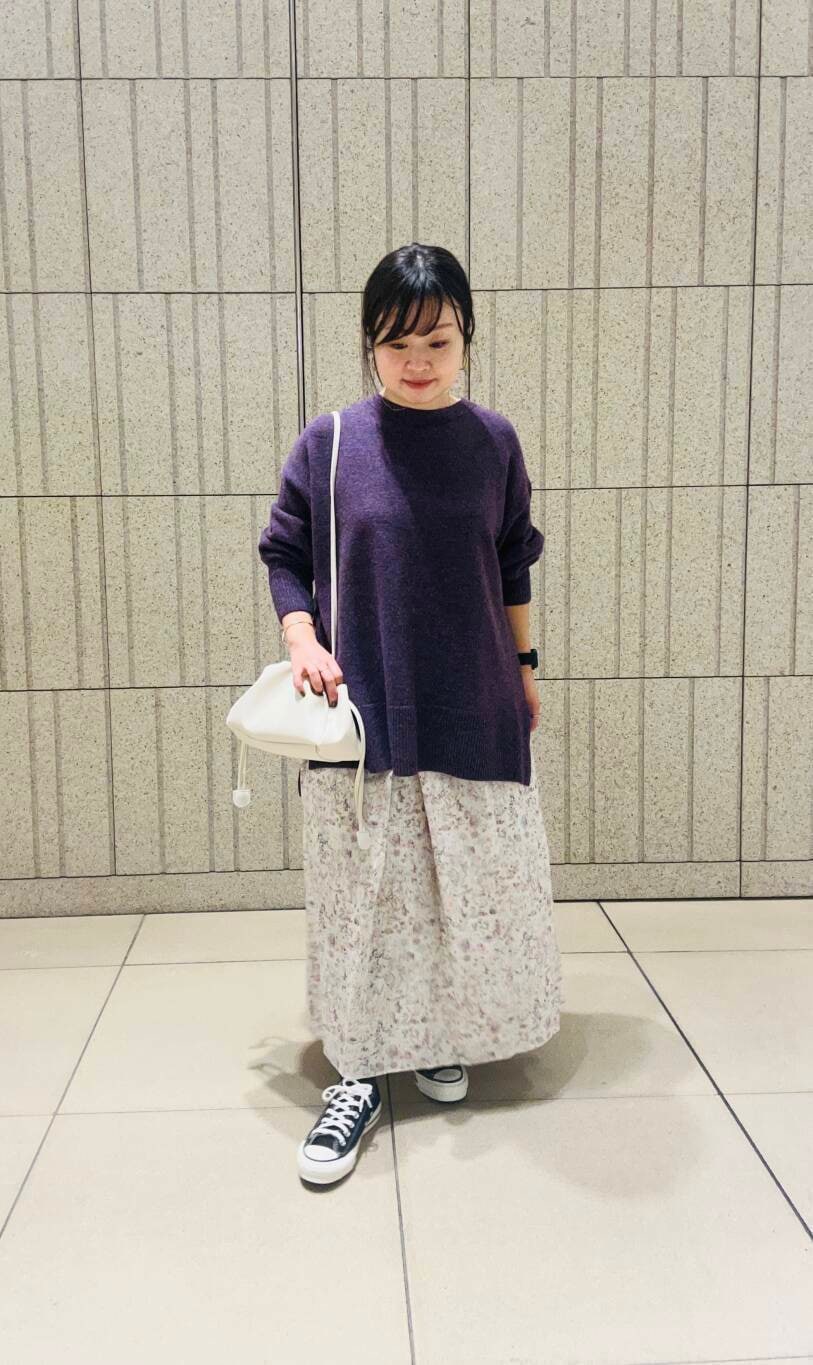 優しい色合いなので、トップスを選ばずに着れます。今回はパープルニットとコンバースでカジュアルコーデにしました。