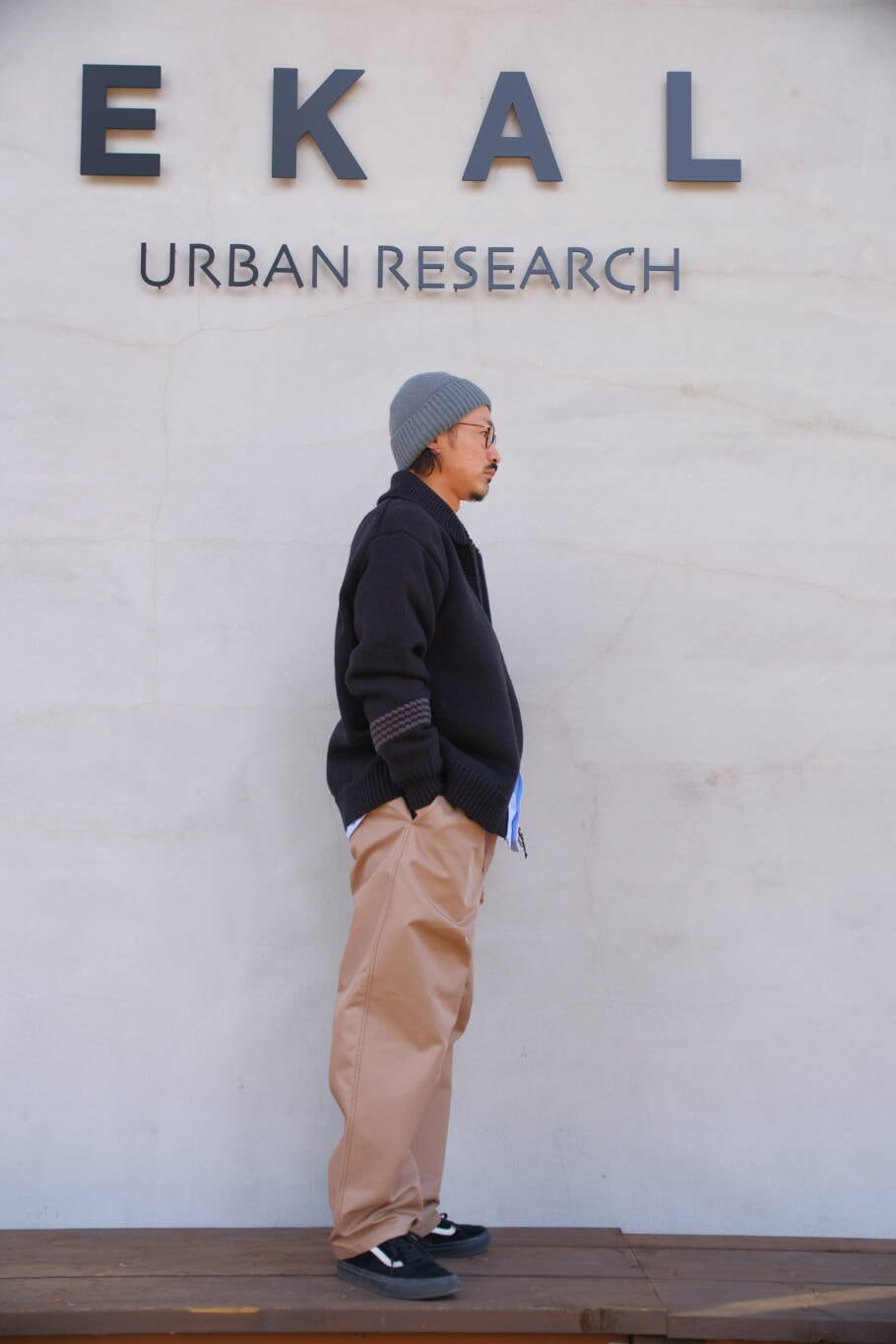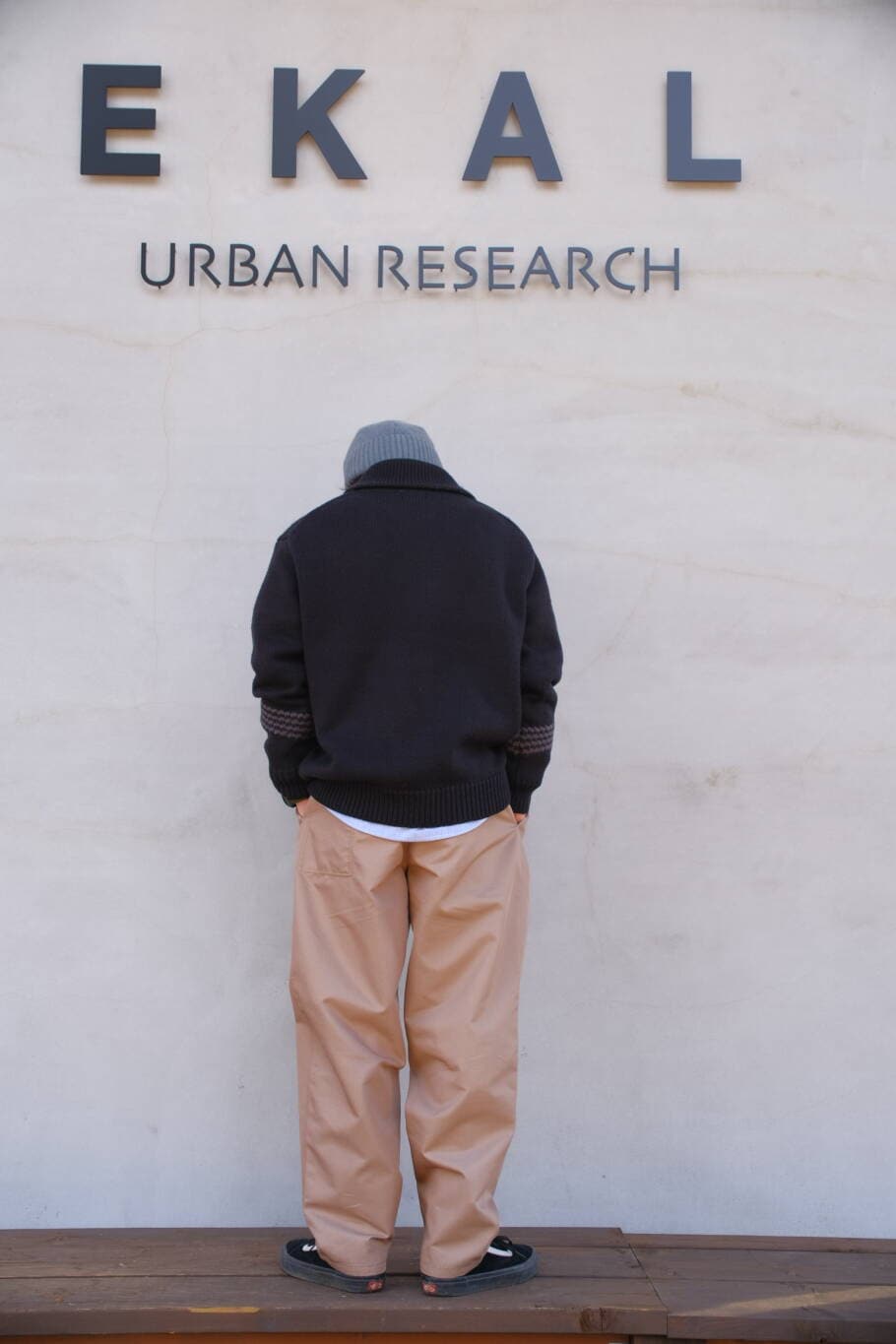 本日はロゴカウチンニットとストライプシャツを合わせた大人カジュアルニットコーデになります!