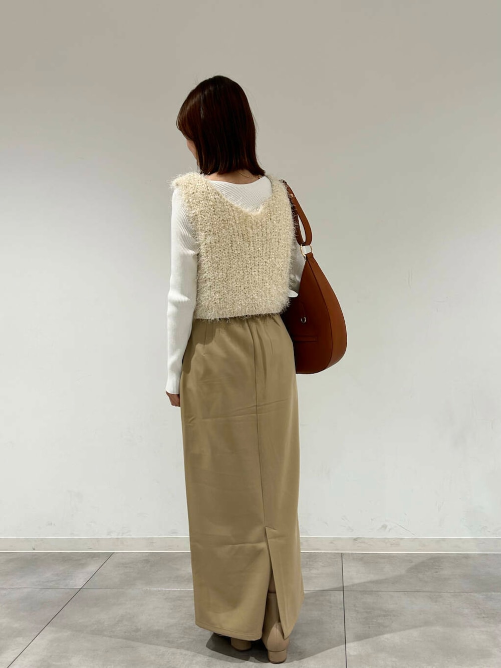 クロップドフェザーヤーンベストはフェザーの柔らかい素材感が女性らしさを出してくれます。