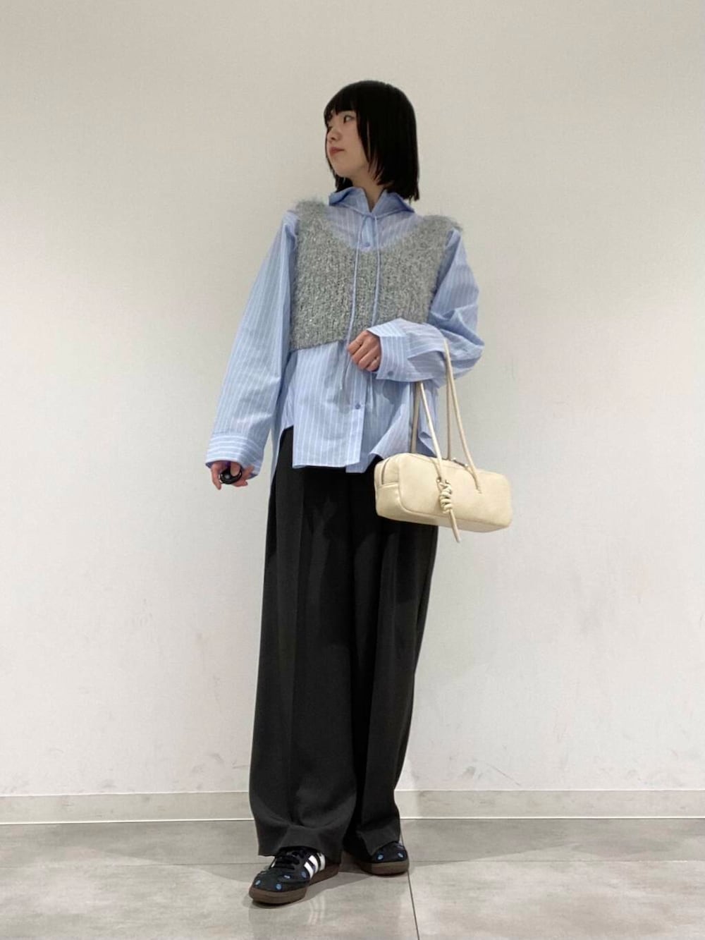 パンツはタックが2箇所入っていてワイドになりつつ、センタープレスなのでシルエットが綺麗に見えます。