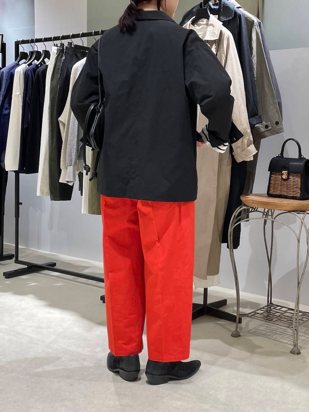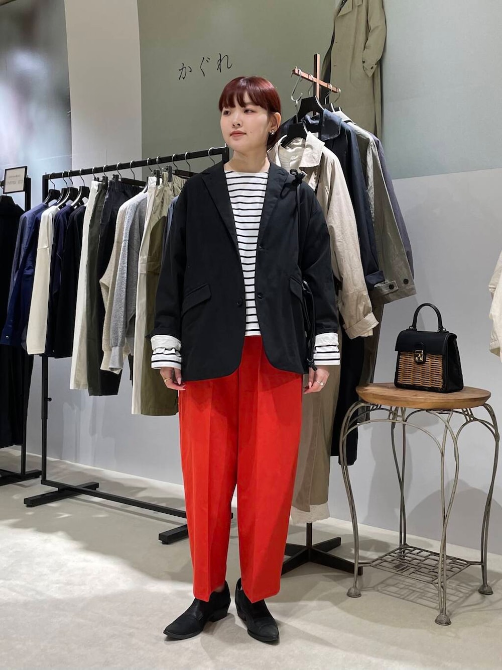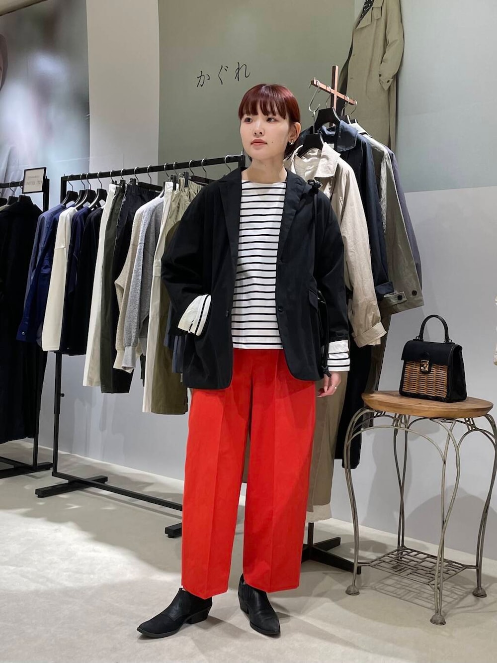 パンツはパッと目を引くレッドカラーがとても素敵です。