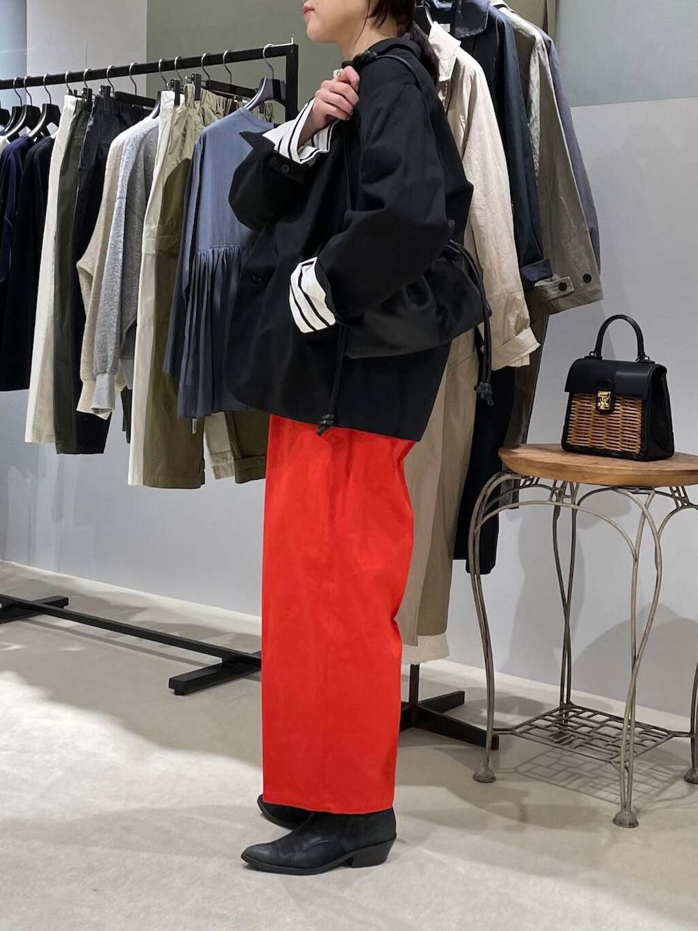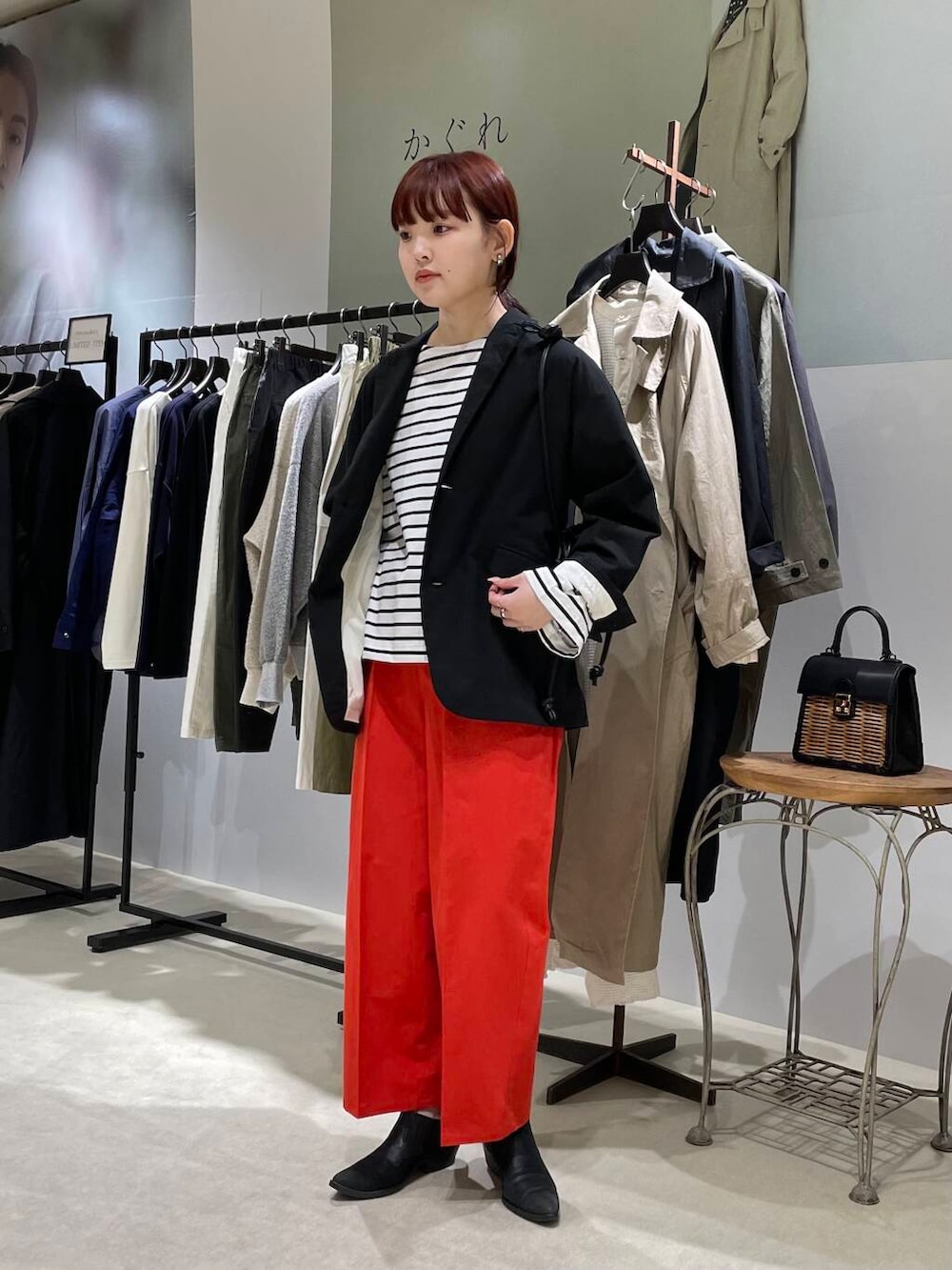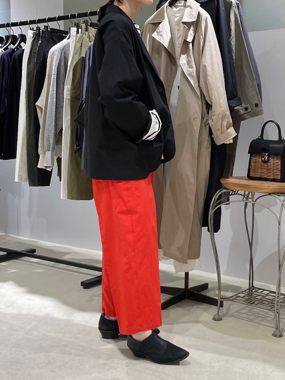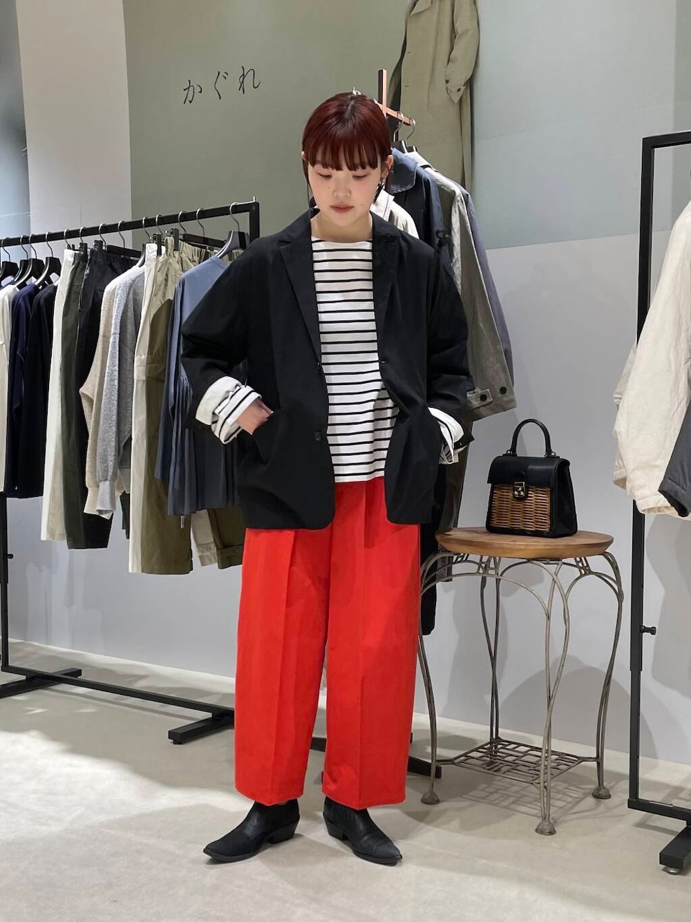 パンツはパッと目を引くレッドカラーがとても素敵です。