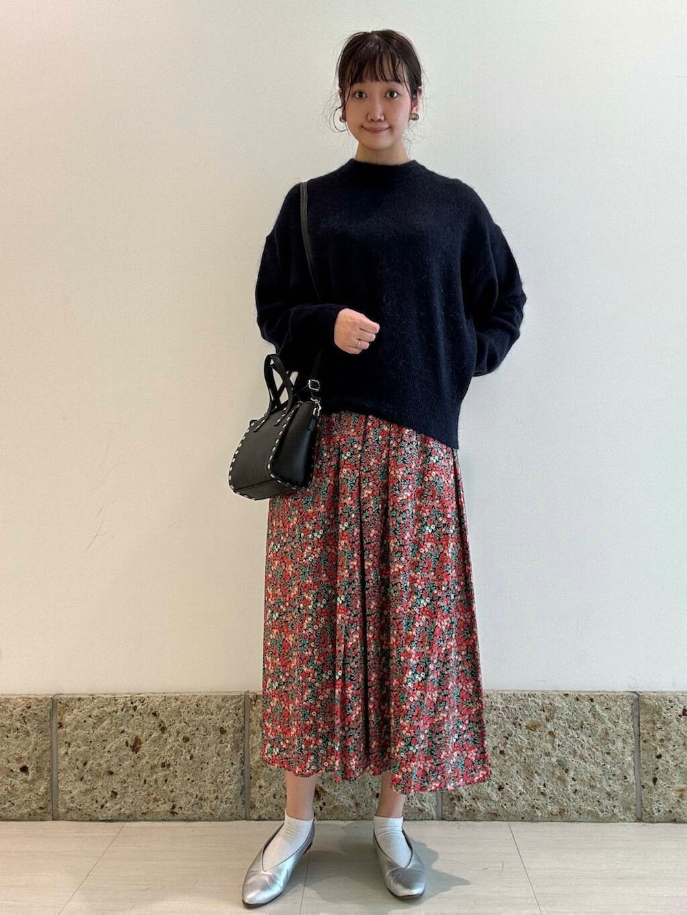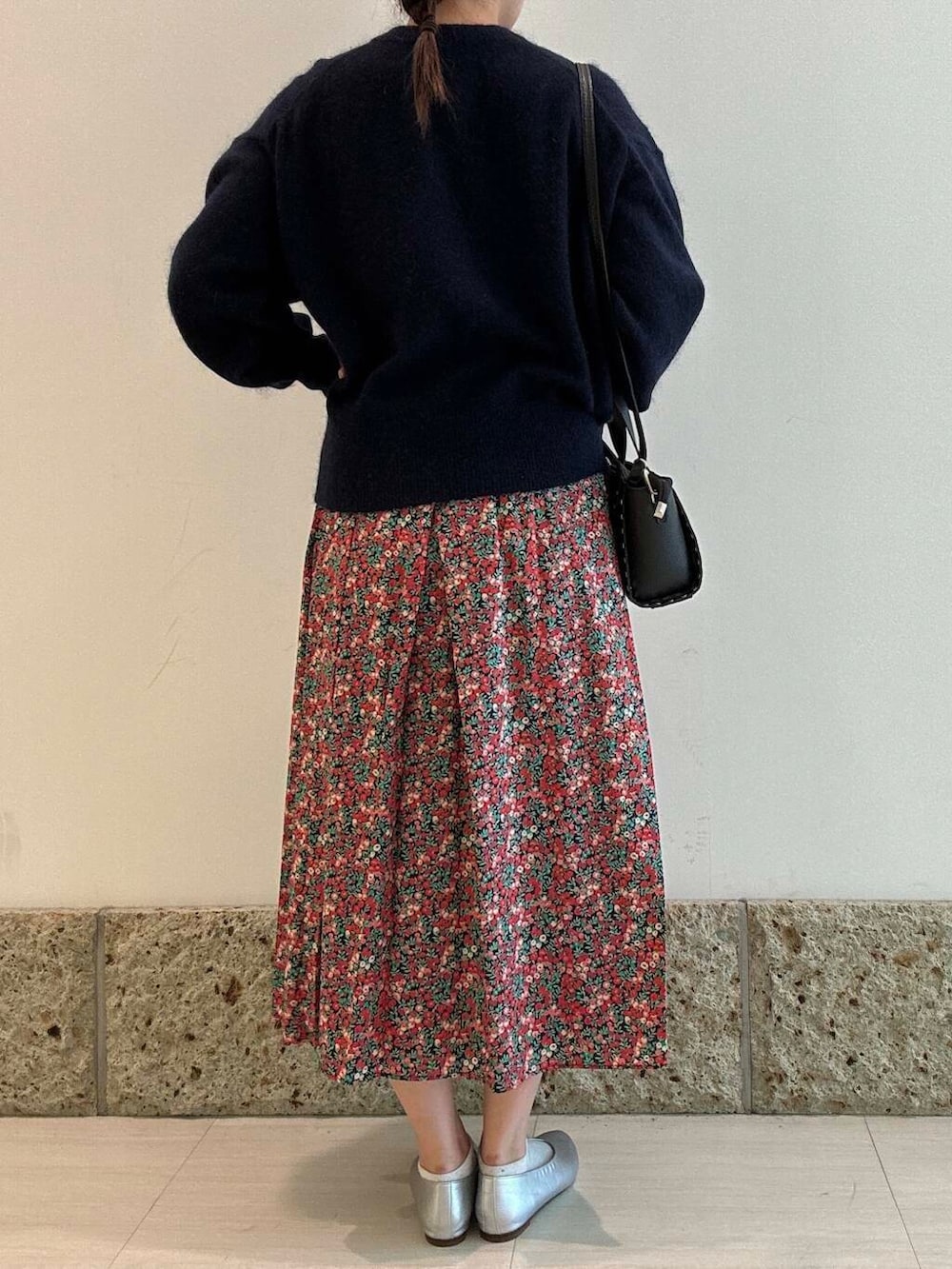 赤い総柄のリバティスカートは派手さがあるかと思いきや、意外となトップスの馴染みます。