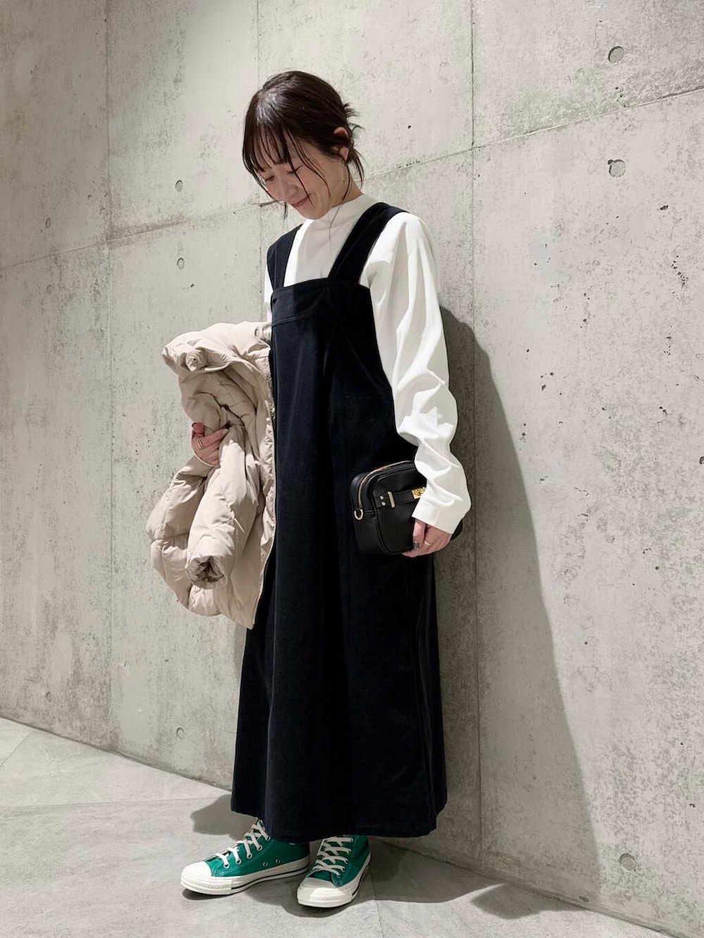 今回は、コーデュロイのジャンパーワンピースを合わせた、大人カジュアルコーディネートです。