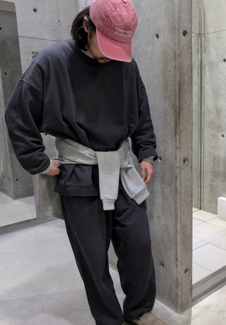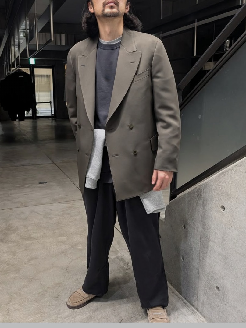 グレーのMIXワントーンのセットアップをダブルの渋めカーキのジャケットと合わせ、唯一無二のスタイリングを組みました。