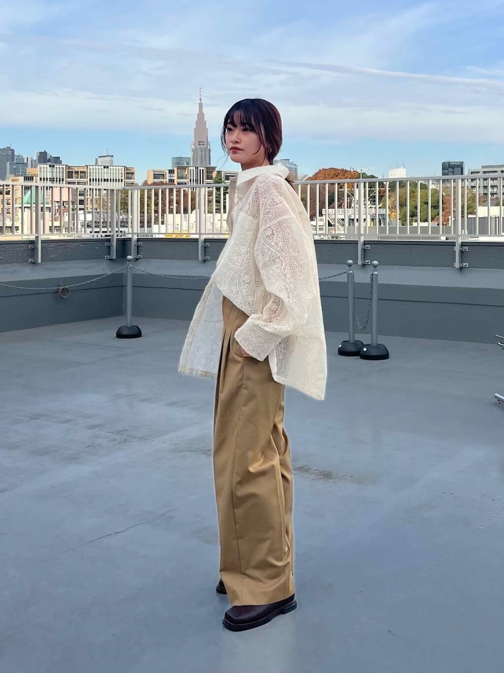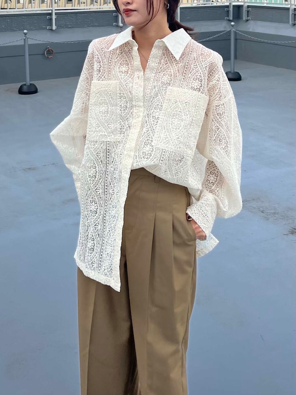私は今回シャツをメインにレースの柄を引き立つよう、シンプルにスラックスを合わせました!シンプルな合わせでもベージュカラーの明るい色合わせするだけで一気に春らしくなりますね🌸