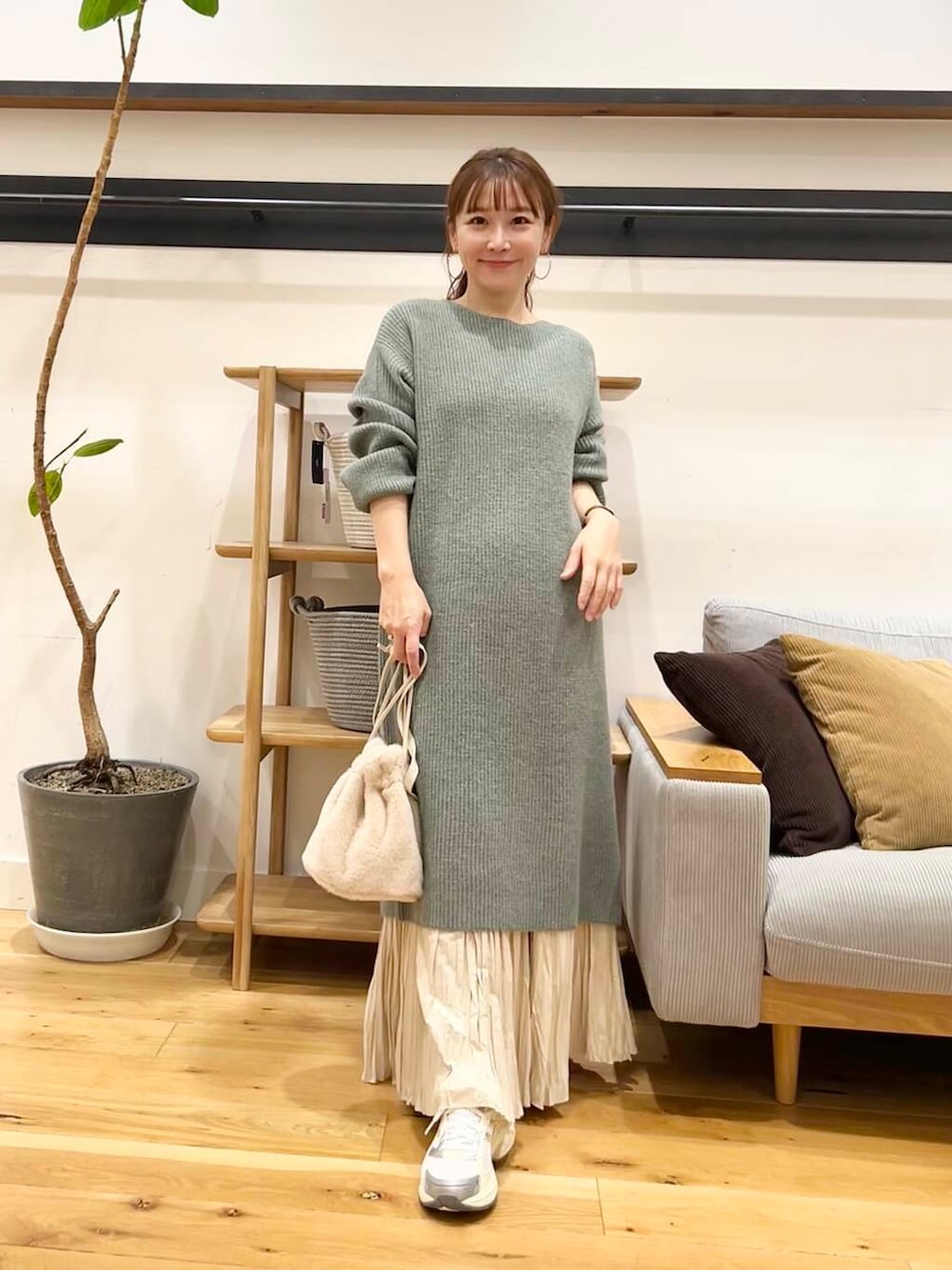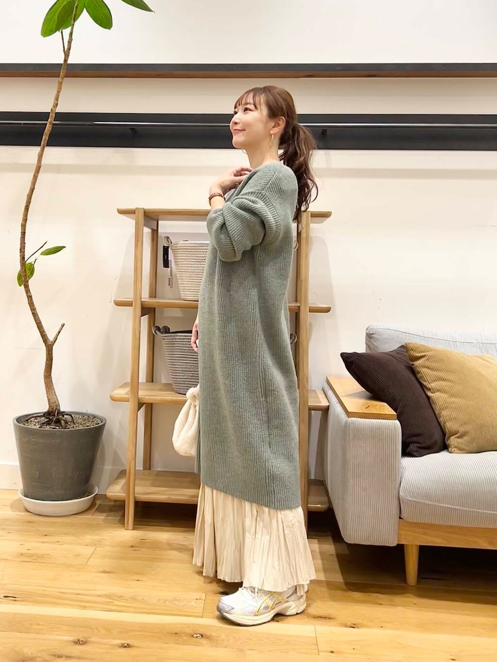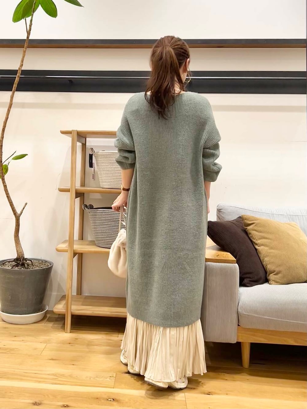 私が履いて膝下までしっかり隠れる着丈なのでワンピースだけでショートブーツやタイツと合わせて、またはロングブーツもいい感じにきまります♪(151cm)