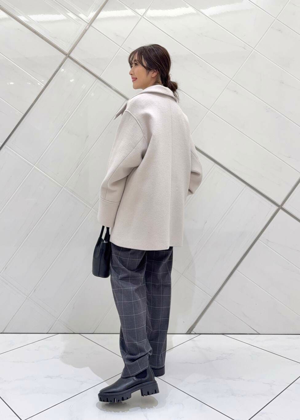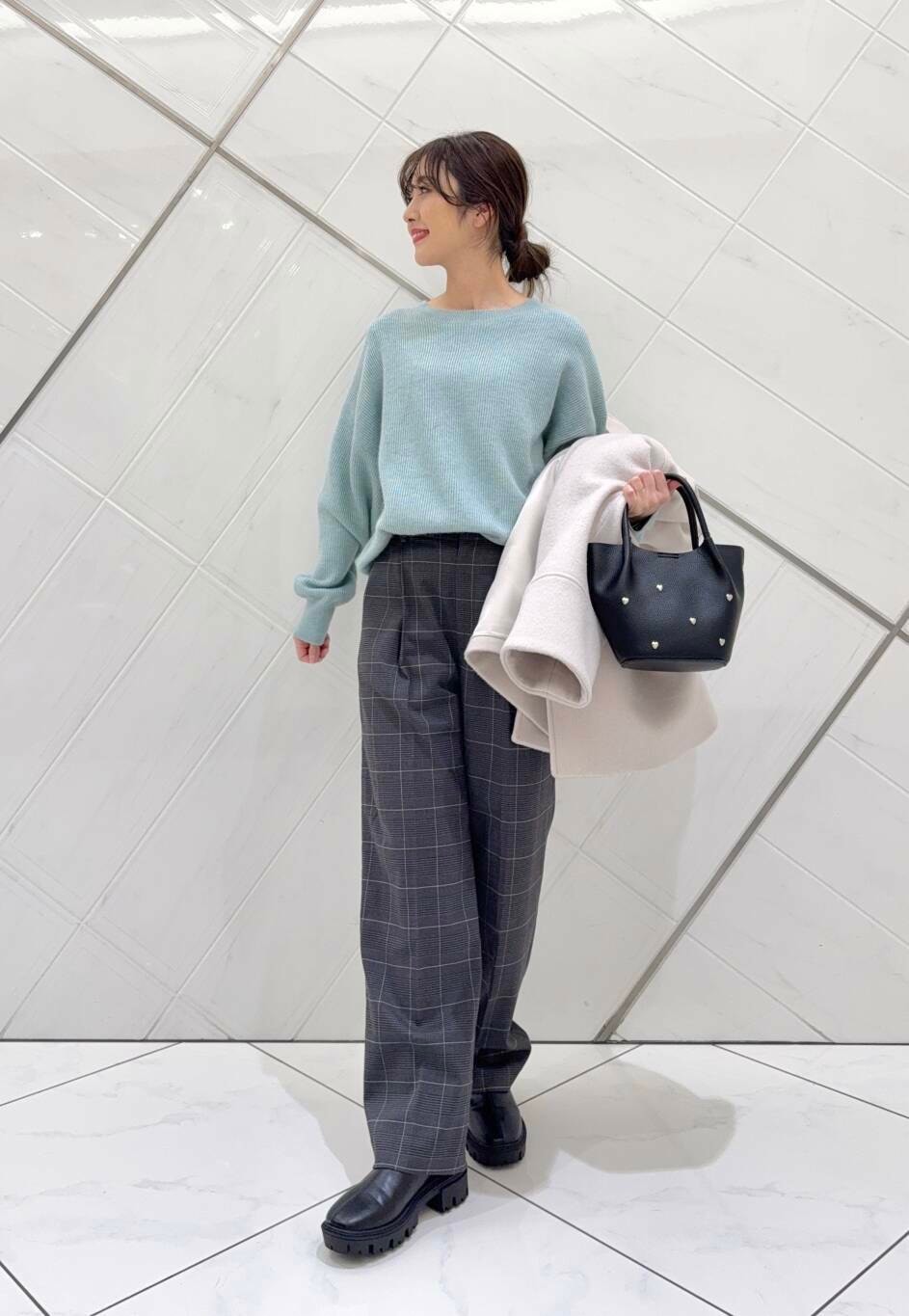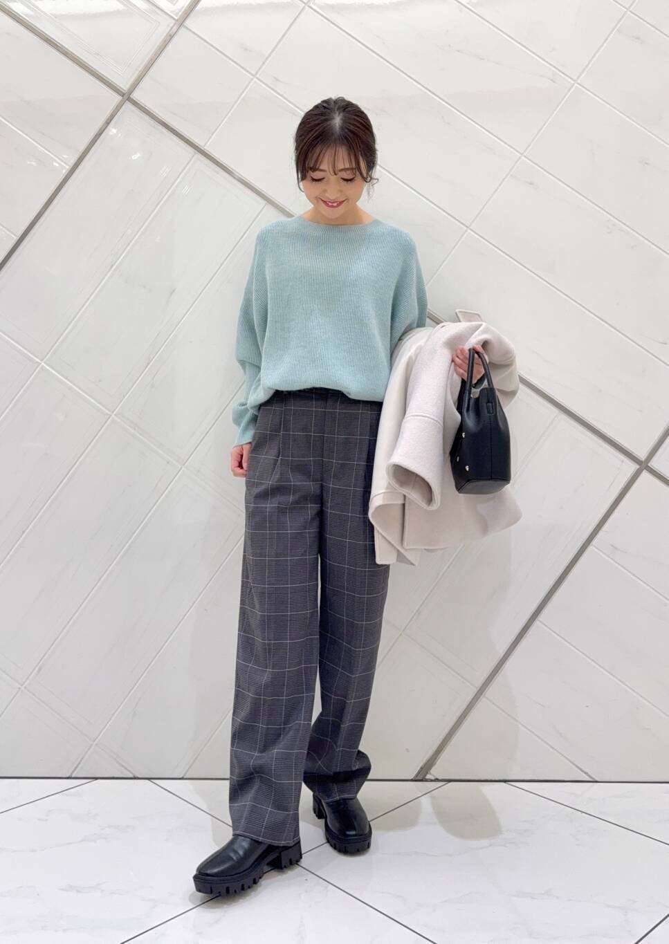 パンツはコーディネートのアクセントになるチェック柄でゆったりめのストレートシルエットです。Sサイズでウエストにゆとりがあります。