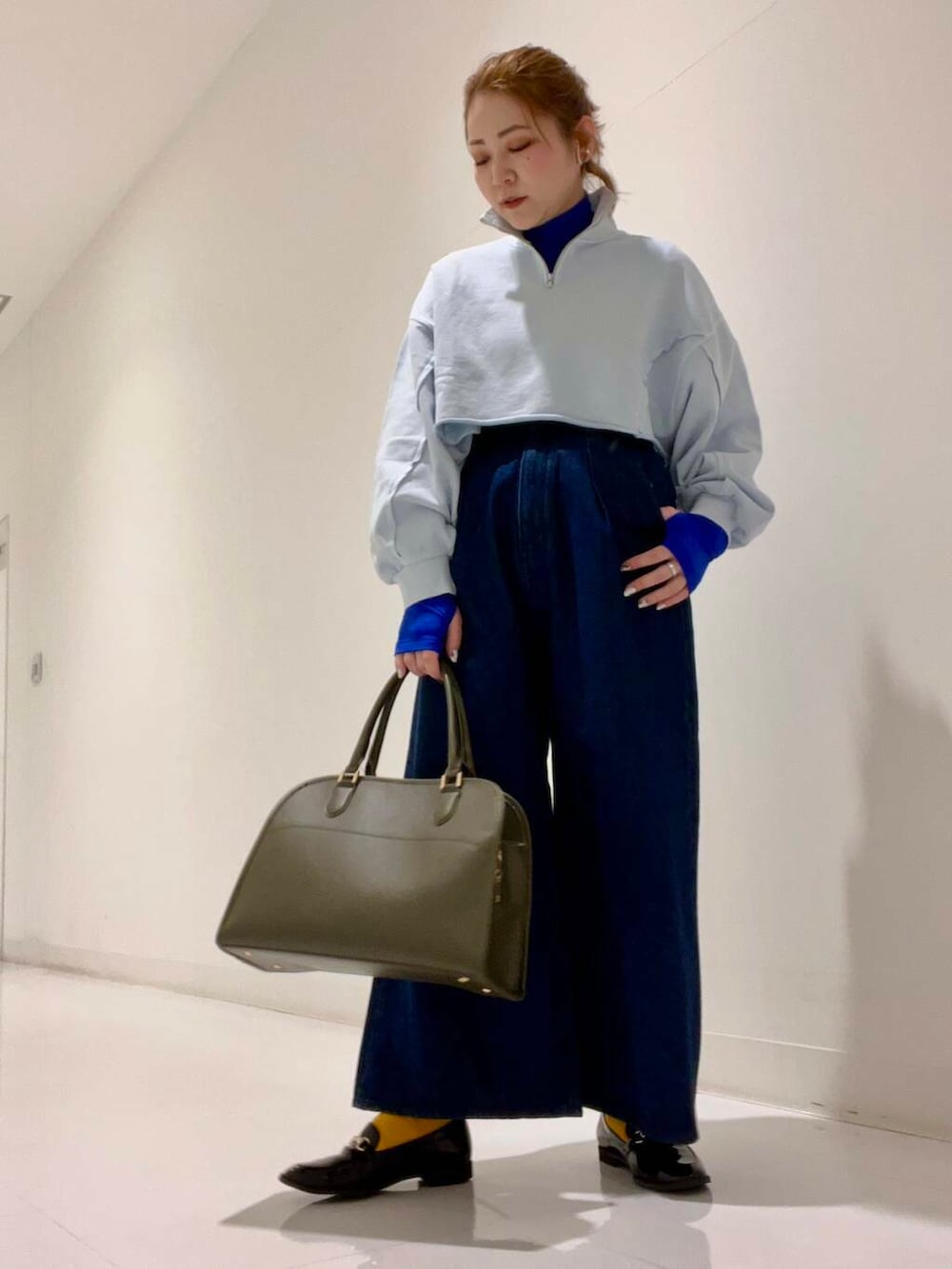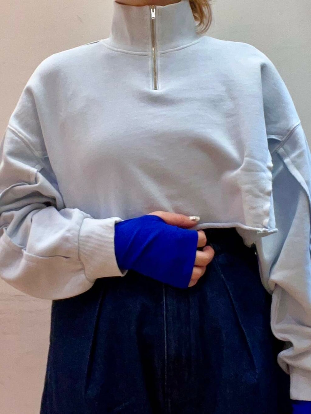 スウェットはジップをあけ中物を鮮やかなブルーでアクセントにしました!バギーパンツはBack部分ゴムで着やすく、締め付け感もなくお出かけにも◉