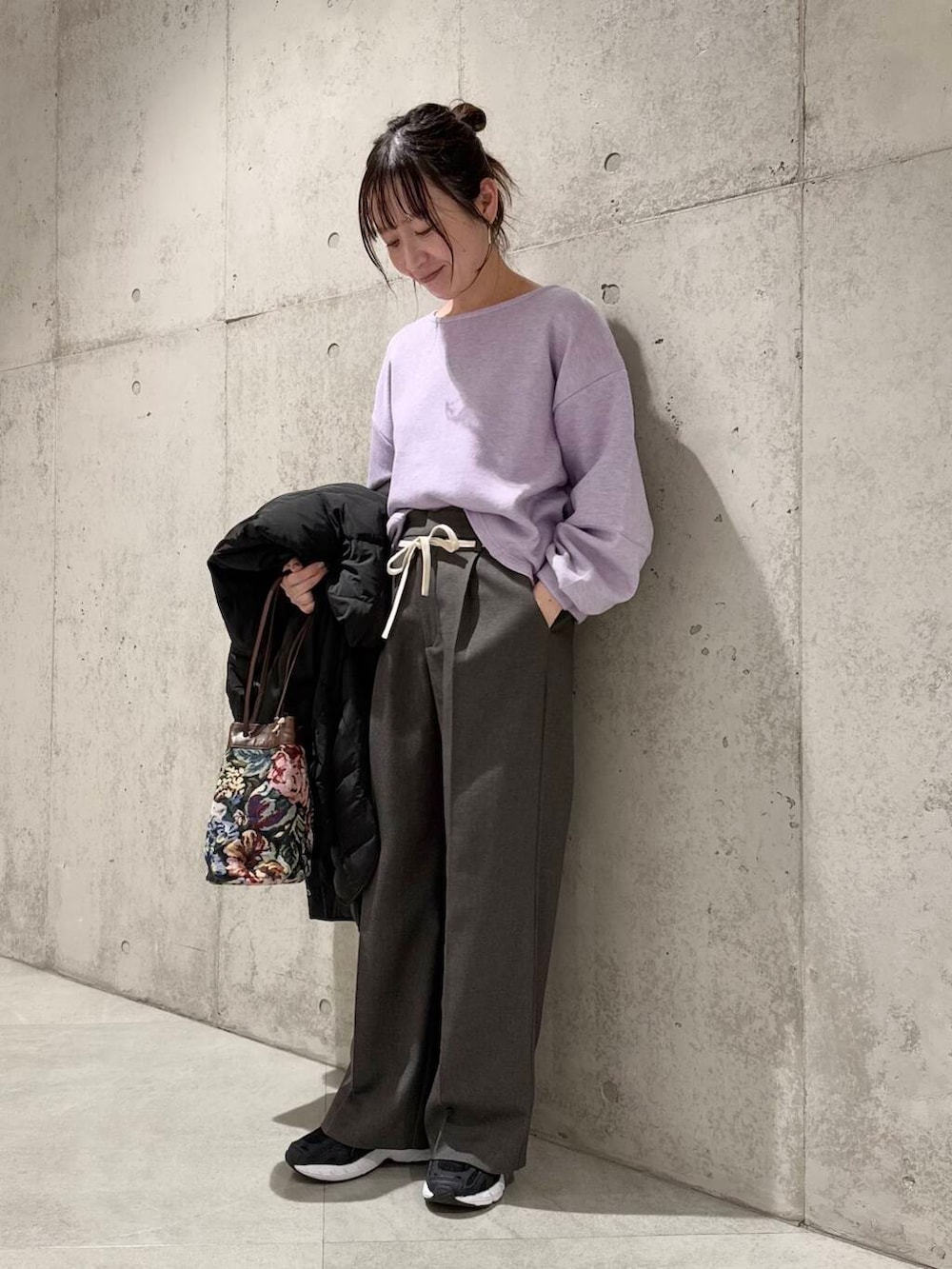 今回は、インナーのラベンダーカラーをアクセントにした、大人カジュアルコーディネート。