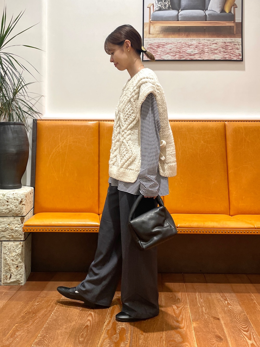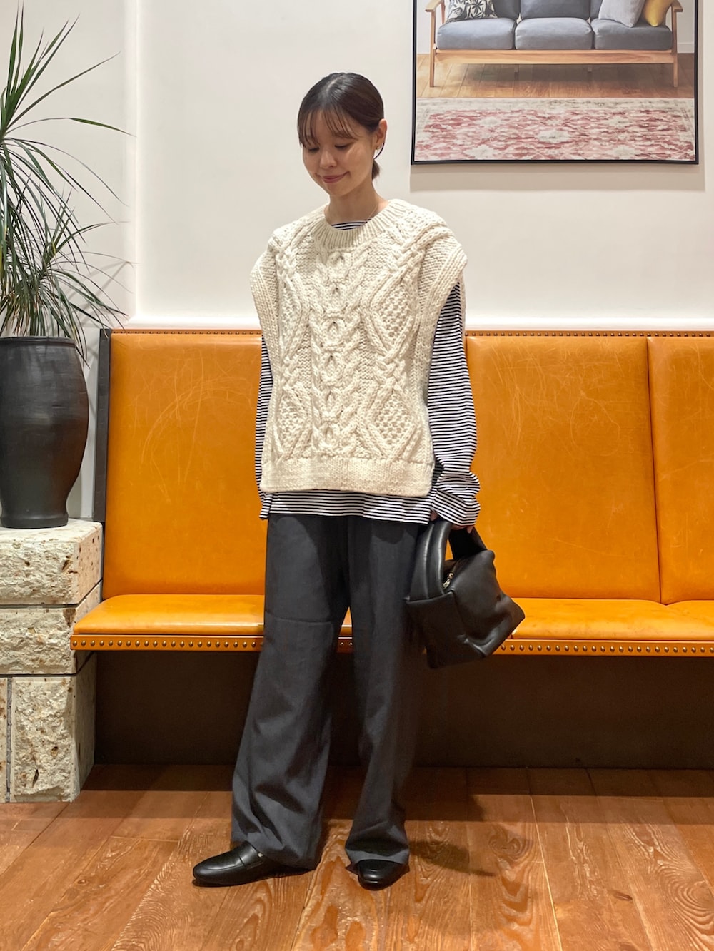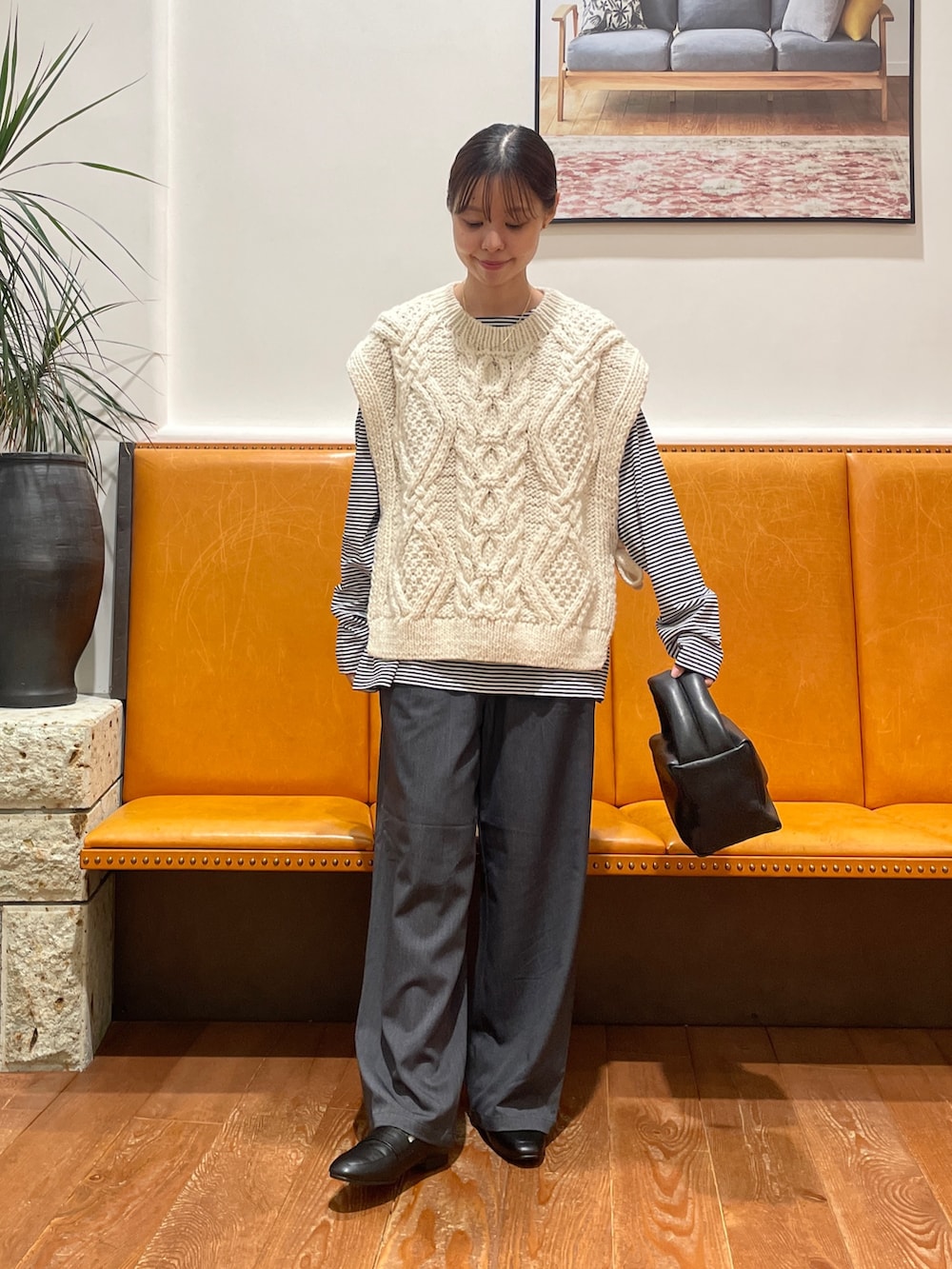ベストはウール100%の素材で暖かみがあり、軽い着心地です。サイドはゆったりしているのでシャツやワンピースなども合わせて頂けます!◎